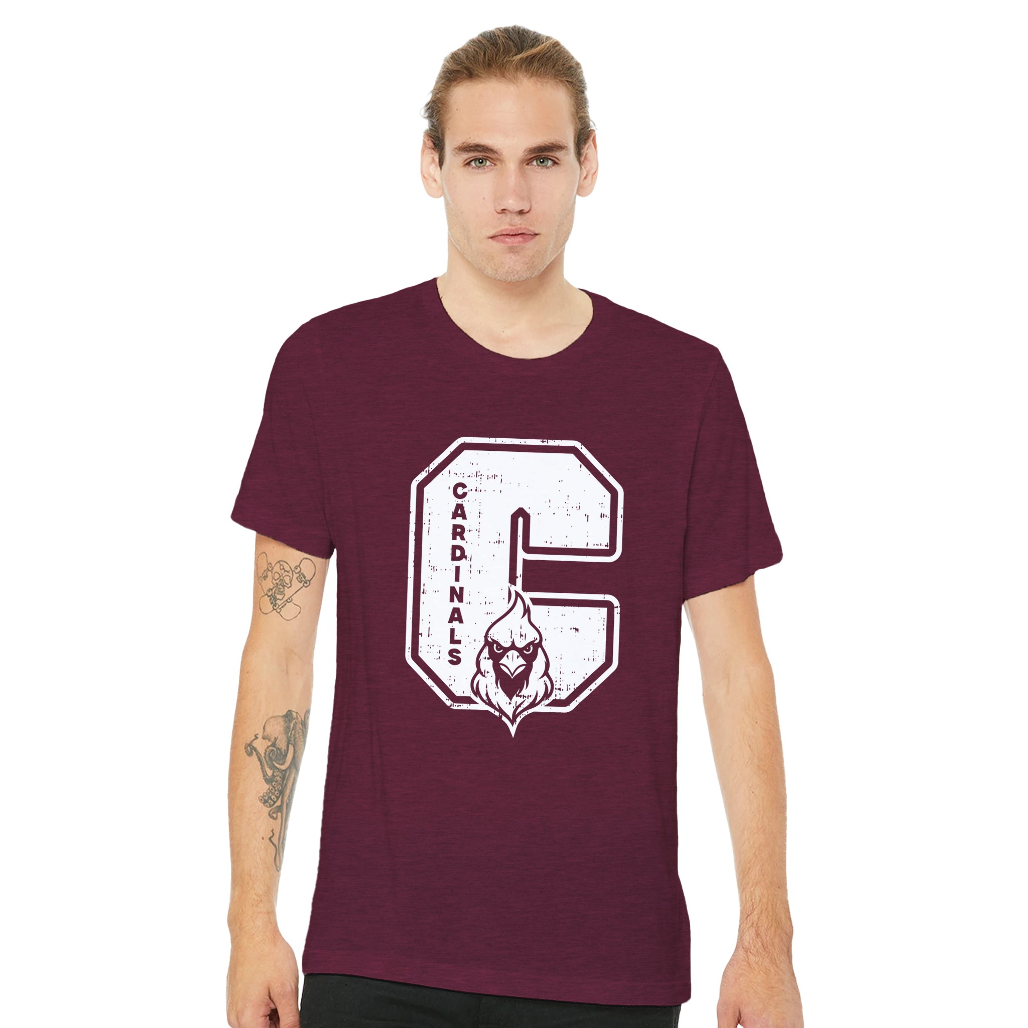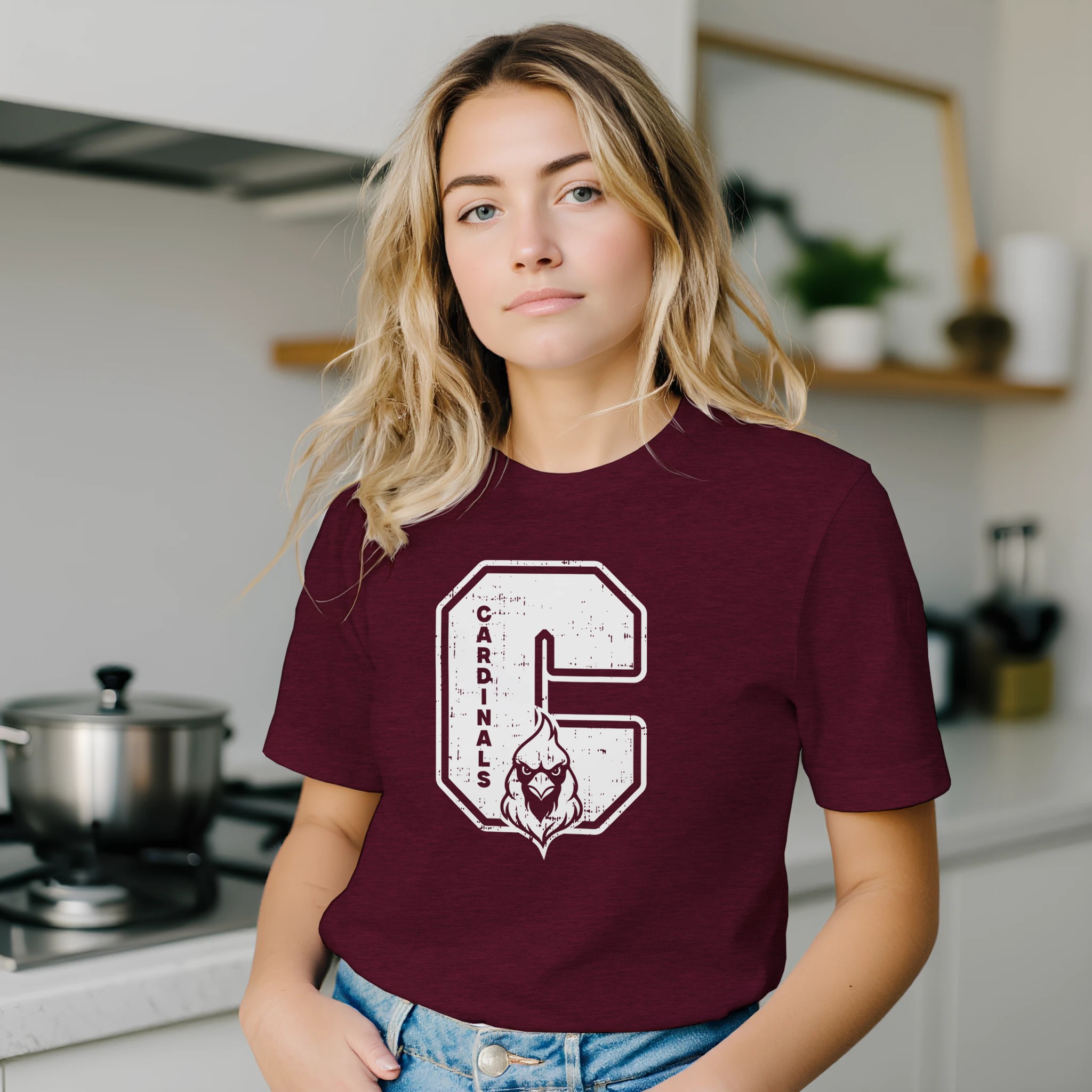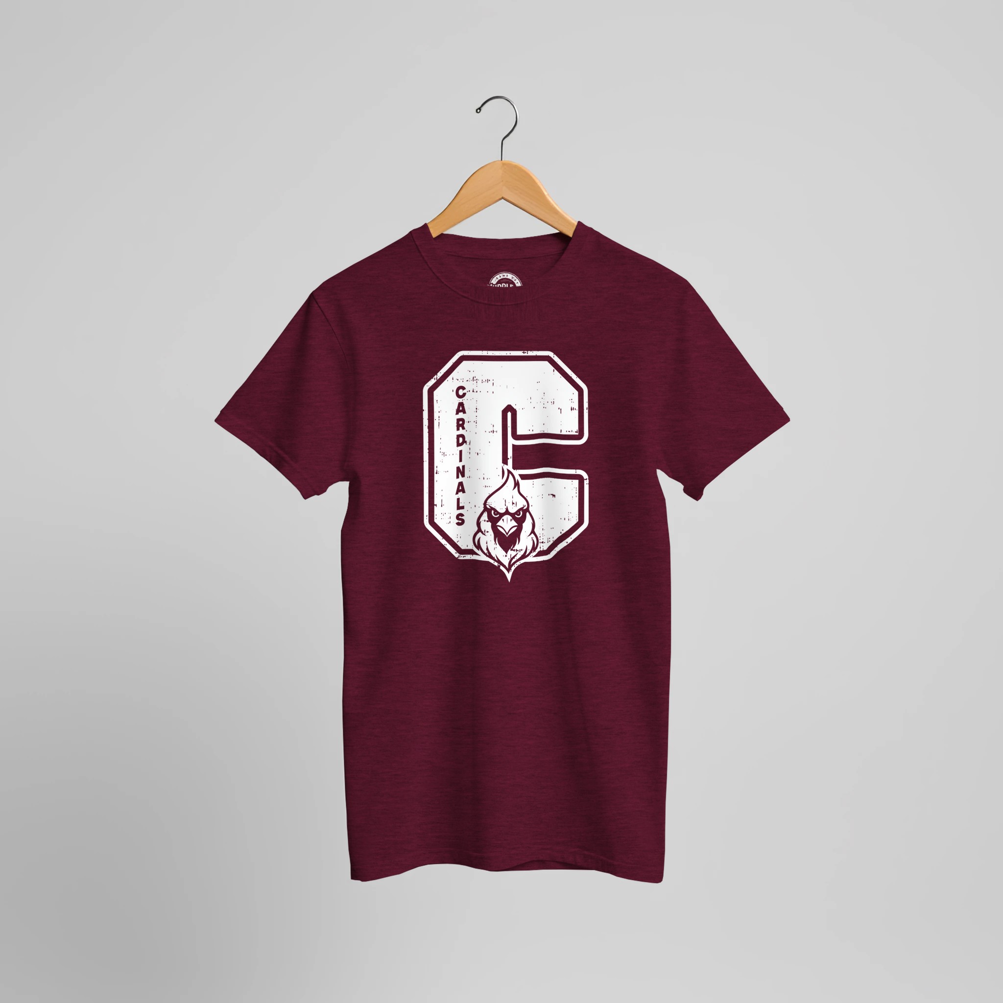 This t-shirt features a powerful athletic design that celebrates Cardinal tradition with classic collegiate style. The centerpiece showcases an oversized, distressed block letter “C” that commands attention from across the stadium. Cleverly integrated within this bold initial, “CARDINALS” runs vertically along the interior edge in matching distressed typography, creating a perfect balance of impact and detail. Anchoring the design is the fierce Cardinal mascot head – a proud symbol of strength and determination that embodies the Cardinal spirit. The all-white distressed print gives this shirt an authentic, time-honored look that feels like it’s been a lucky favorite for generations.