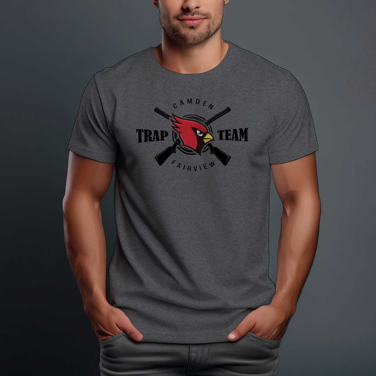 Represent your team with a design that blends tradition and intensity. This “Camden Fairview Trap Team” graphic features a bold cardinal mascot front and center, backed by crossed shotguns and a target-ring backdrop.