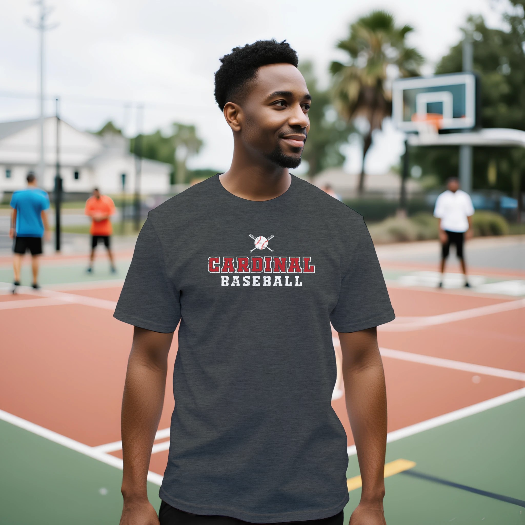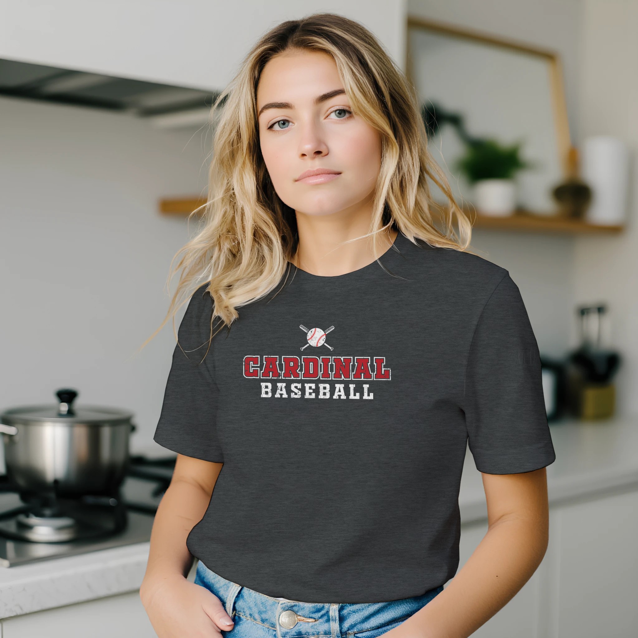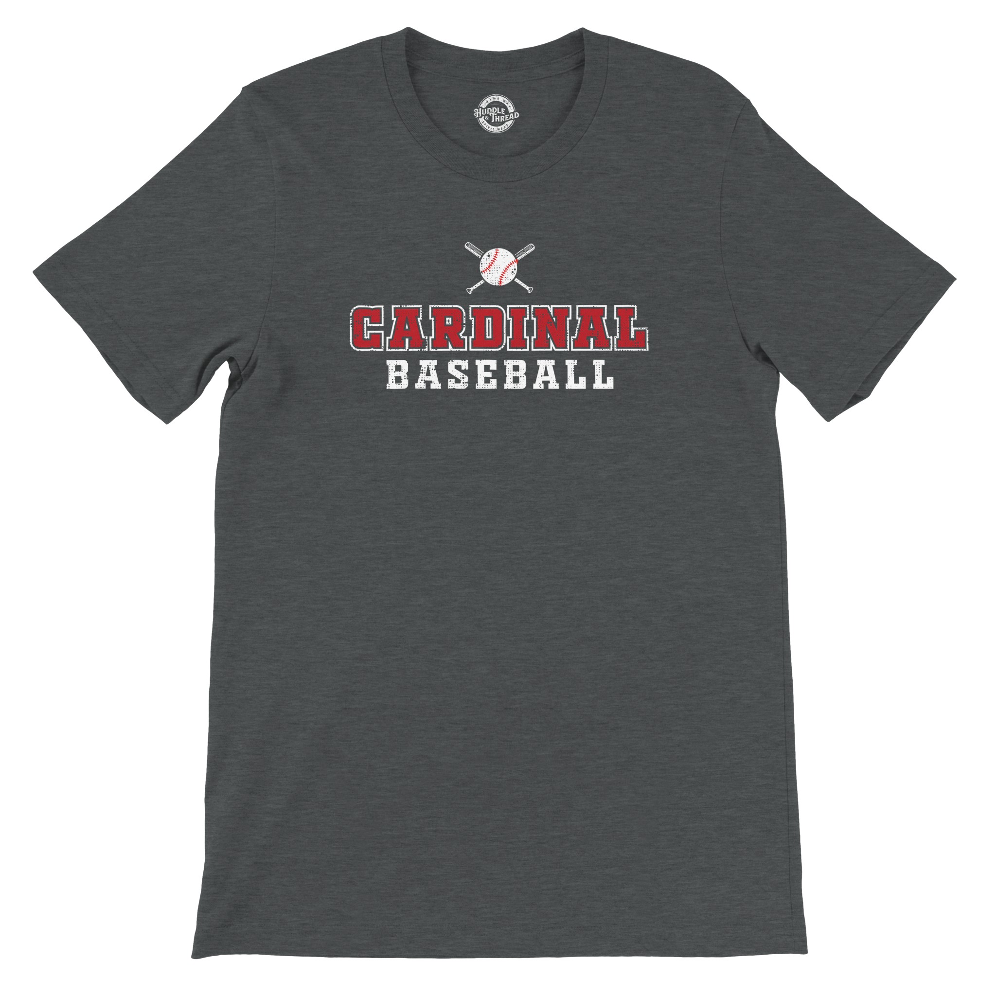 This Cardinal Baseball design delivers clean, classic team style with bold collegiate lettering and a vintage bat-and-ball emblem centered above the text. The crisp red and white layout gives the shirt a timeless athletic look perfect for players, parents, and fans who want something simple, sharp, and easy to wear.
