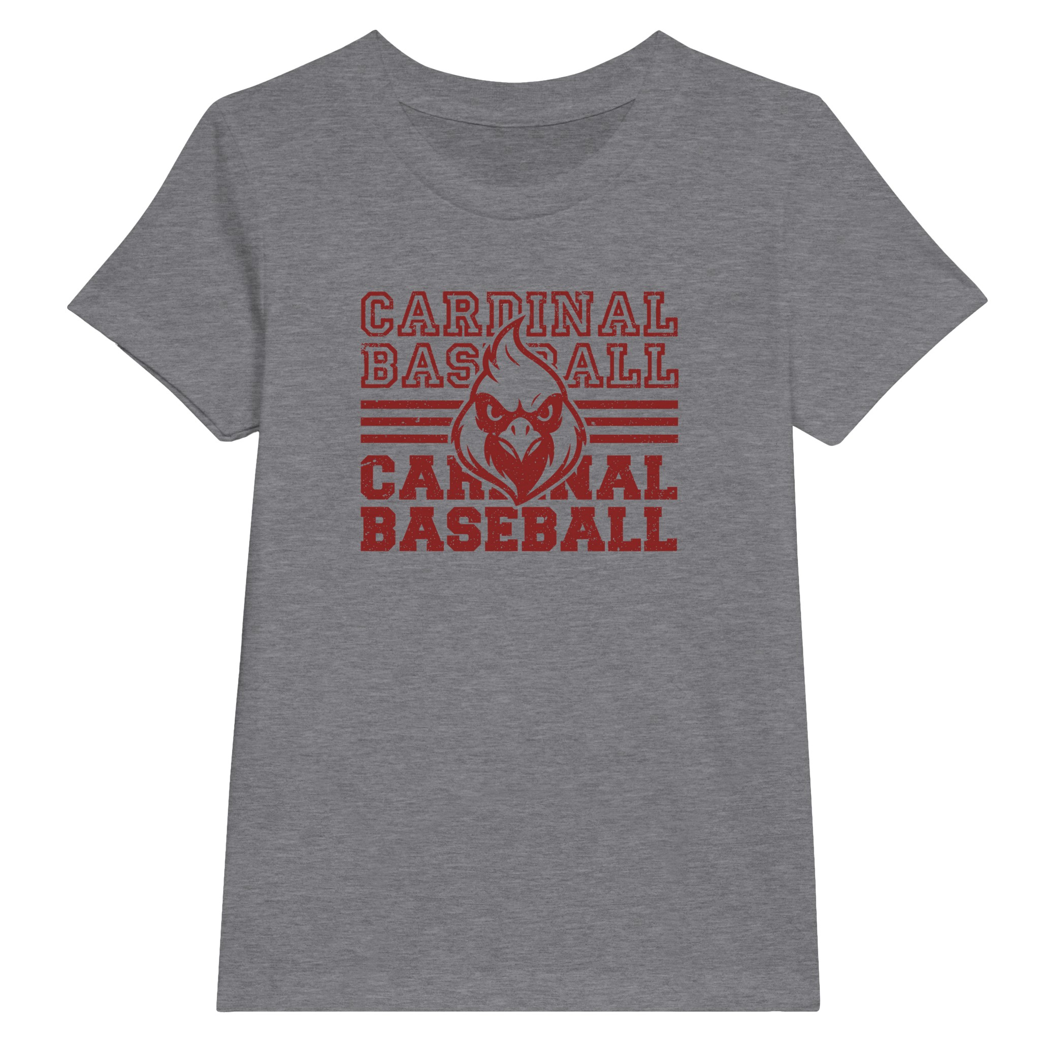 This Cardinal Baseball design delivers a bold, vintage athletic look with stacked lettering, horizontal stripe accents, and a fierce cardinal mascot front and center. The distressed print adds a retro, worn-in feel that makes the design stand out on game days, school events, or everyday casual wear. It’s a strong, classic layout that appeals to players, families, and fans who want to show their team spirit in a big way.