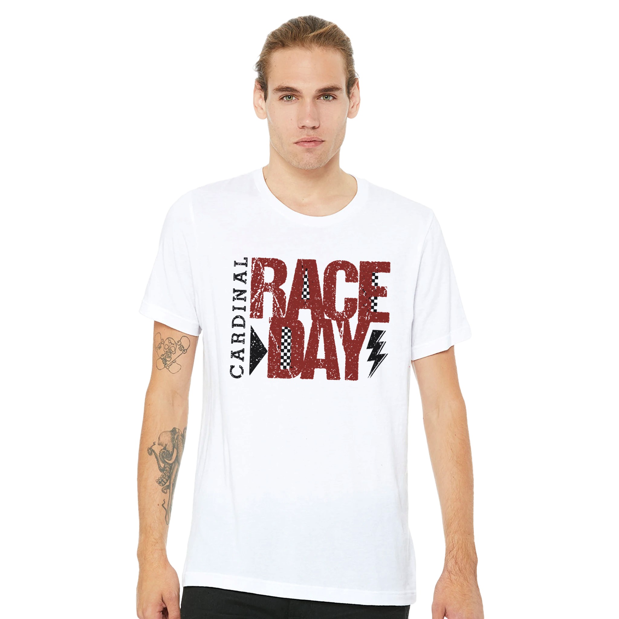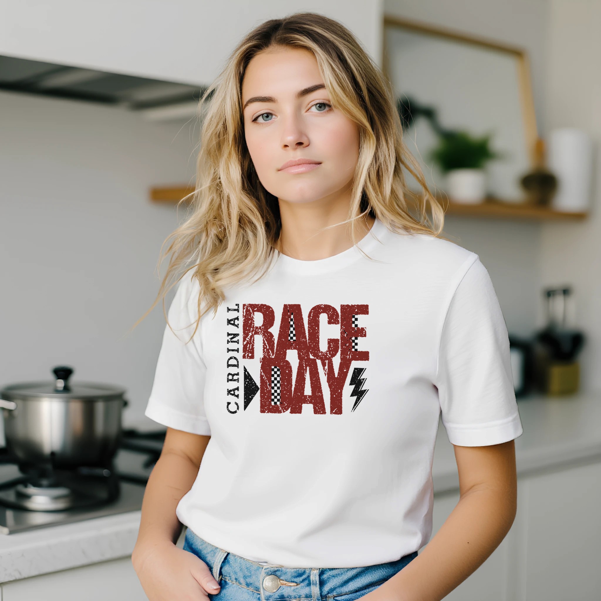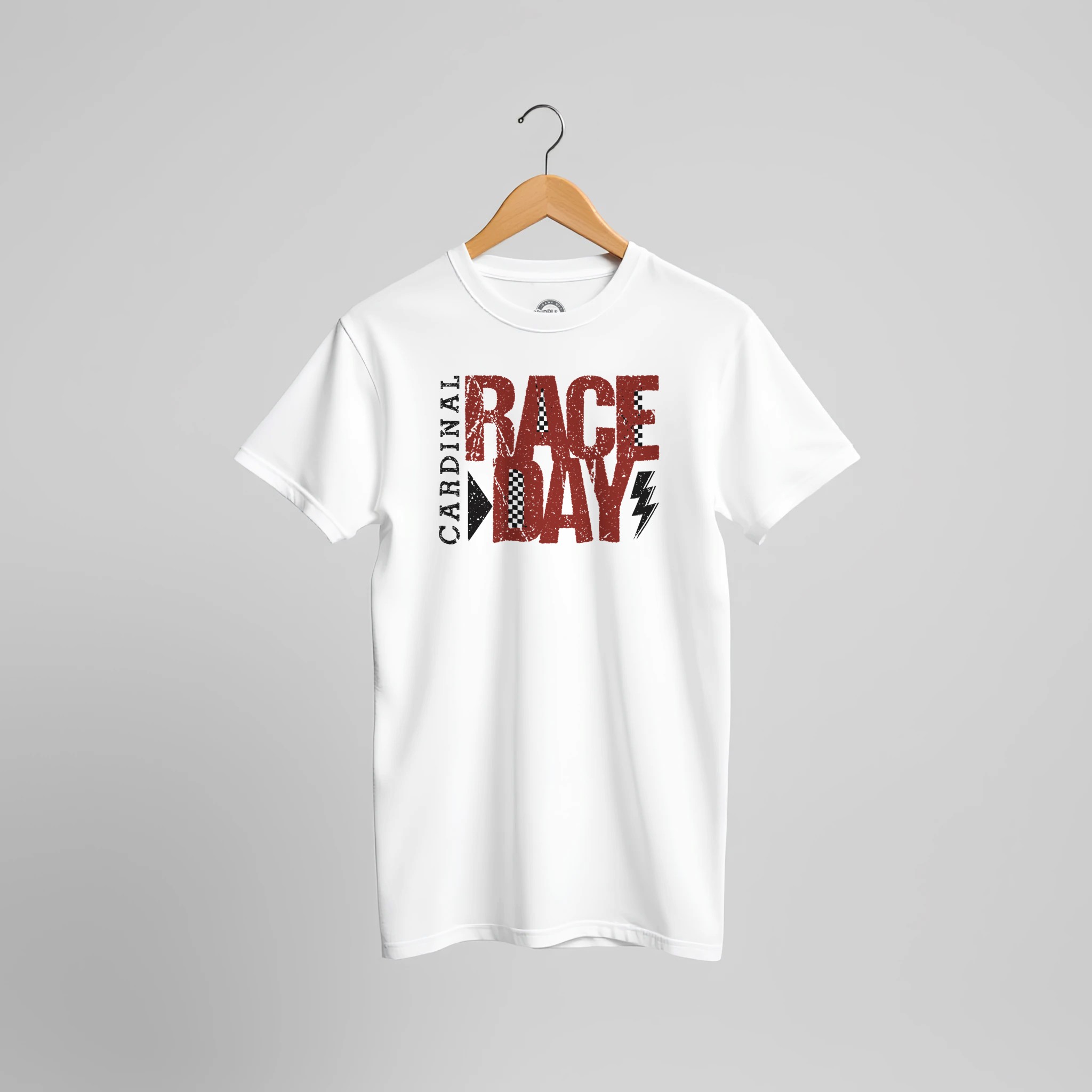 Get ready for the fast lane with our Cardinal Race Day graphic. Featuring a bold, distressed “Race Day” block font and classic checkered flag accents, this design captures the adrenaline of the track. Whether you’re at the stadium or on the streets, this look brings a high-octane vintage vibe to your wardrobe.