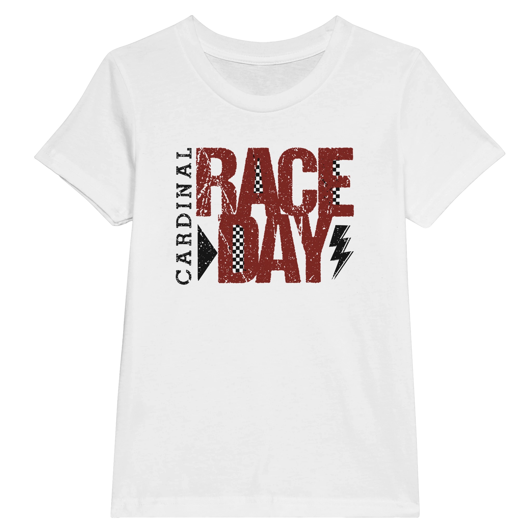 Get ready for the fast lane with our Cardinal Race Day graphic. Featuring a bold, distressed “Race Day” block font and classic checkered flag accents, this design captures the adrenaline of the track. Whether you’re at the stadium or on the streets, this look brings a high-octane vintage vibe to your wardrobe.