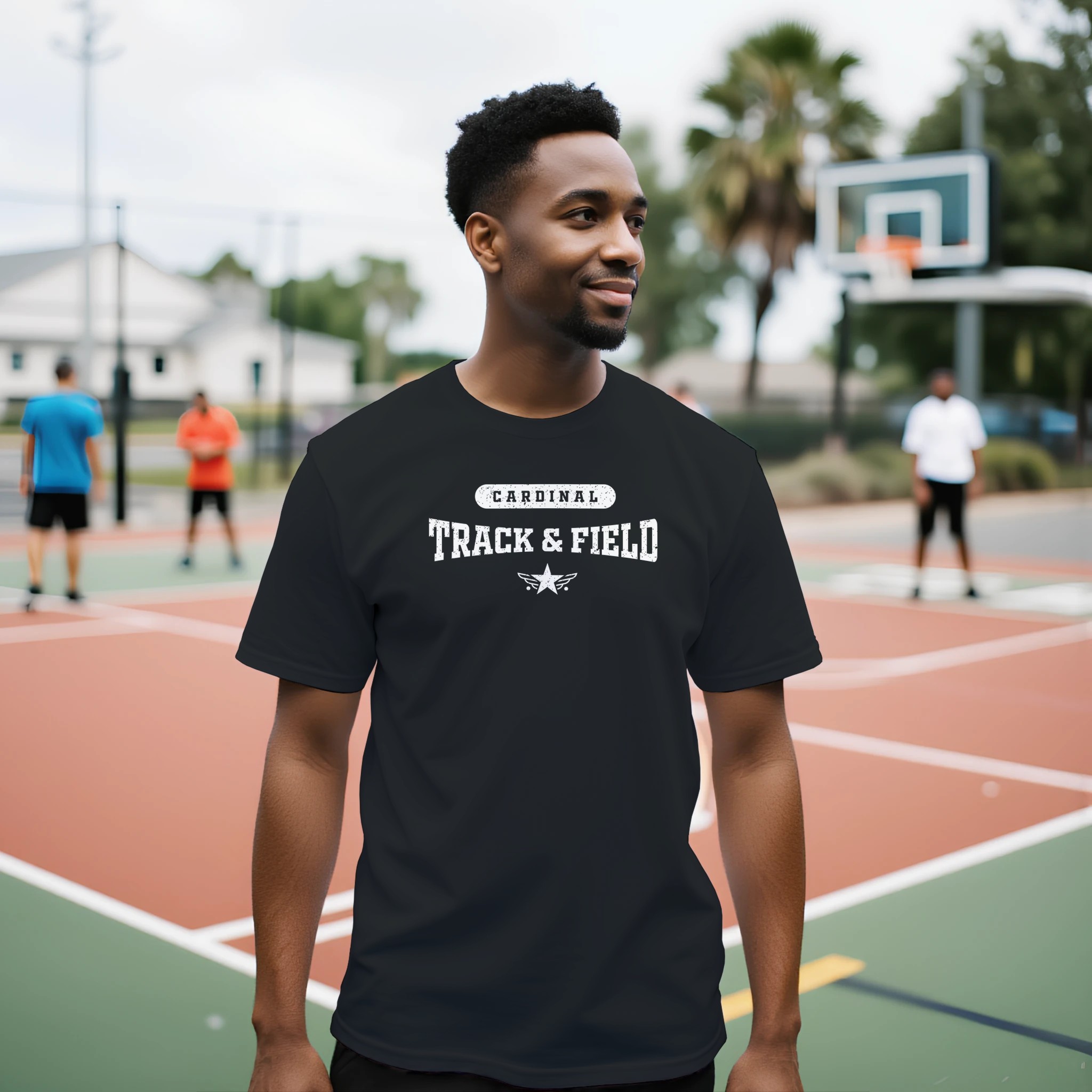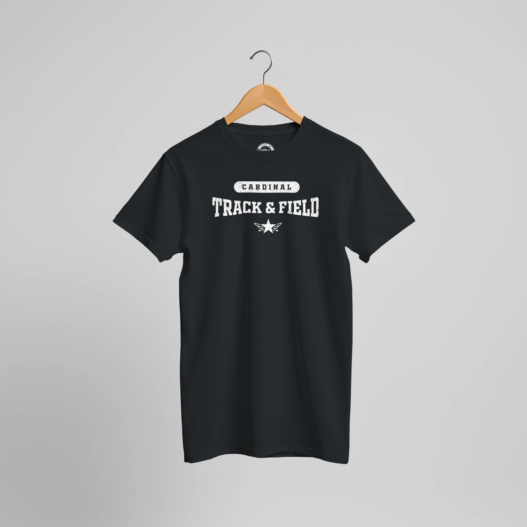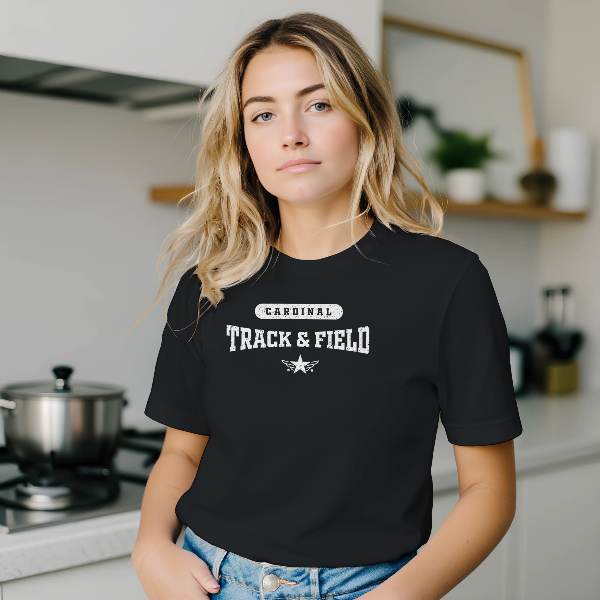 Get that authentic, lived-in look with our Cardinal Track & Field gear. This design features a classic arched varsity font and a speed-star emblem, all finished with a heavy distressed texture for a true vintage feel. Whether you’re layering up for a chilly morning meet in a hoodie or keeping it casual in a sweatshirt, this design brings timeless athletic style to your wardrobe.