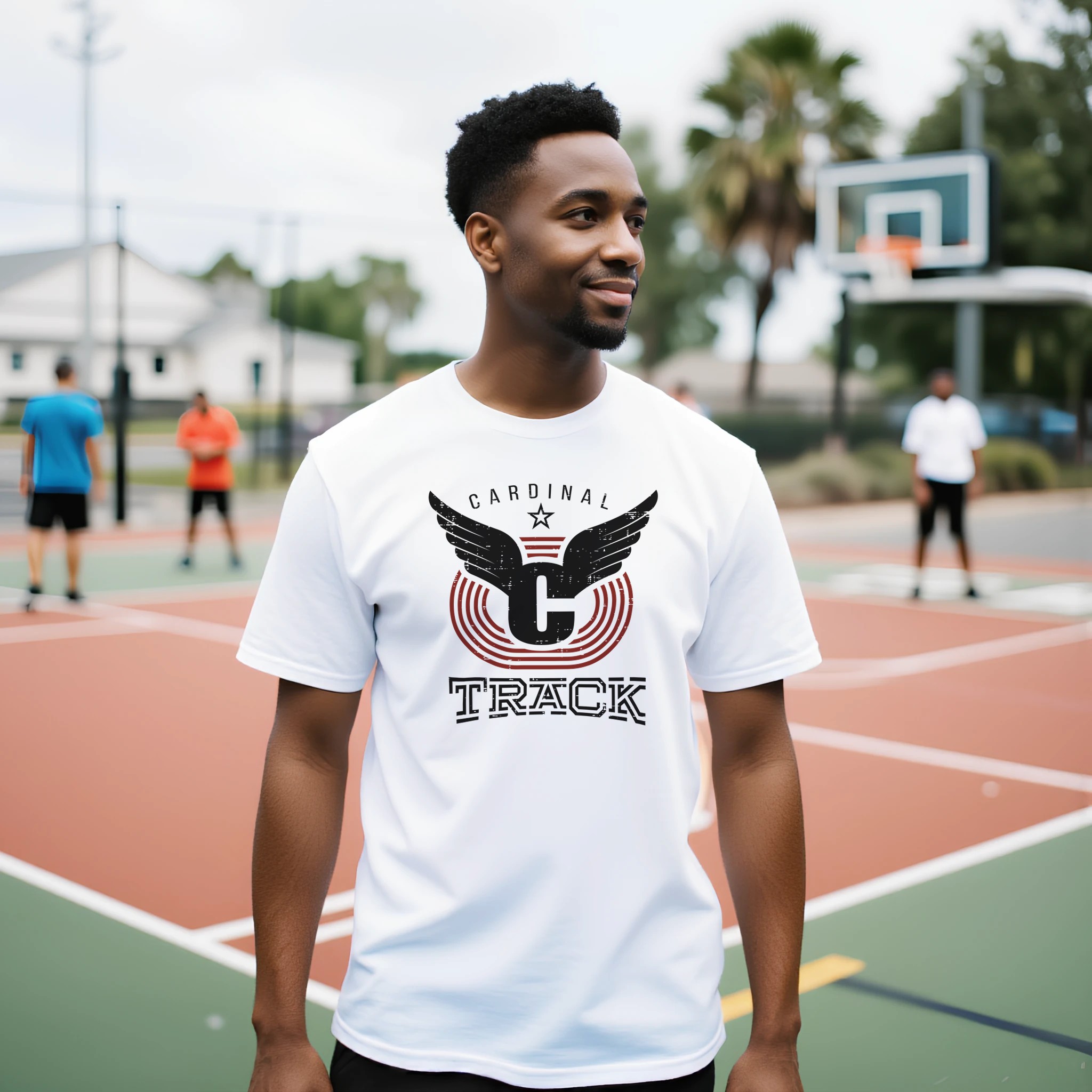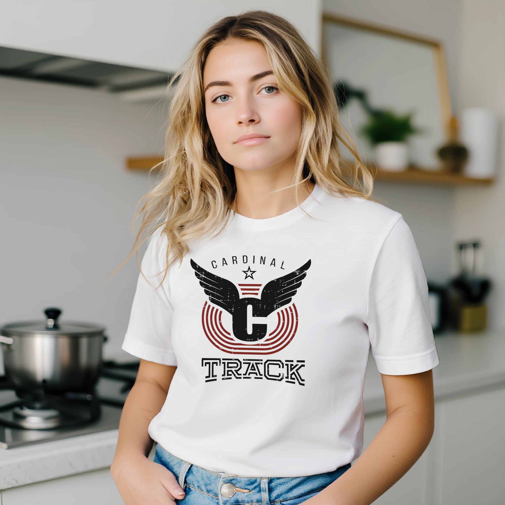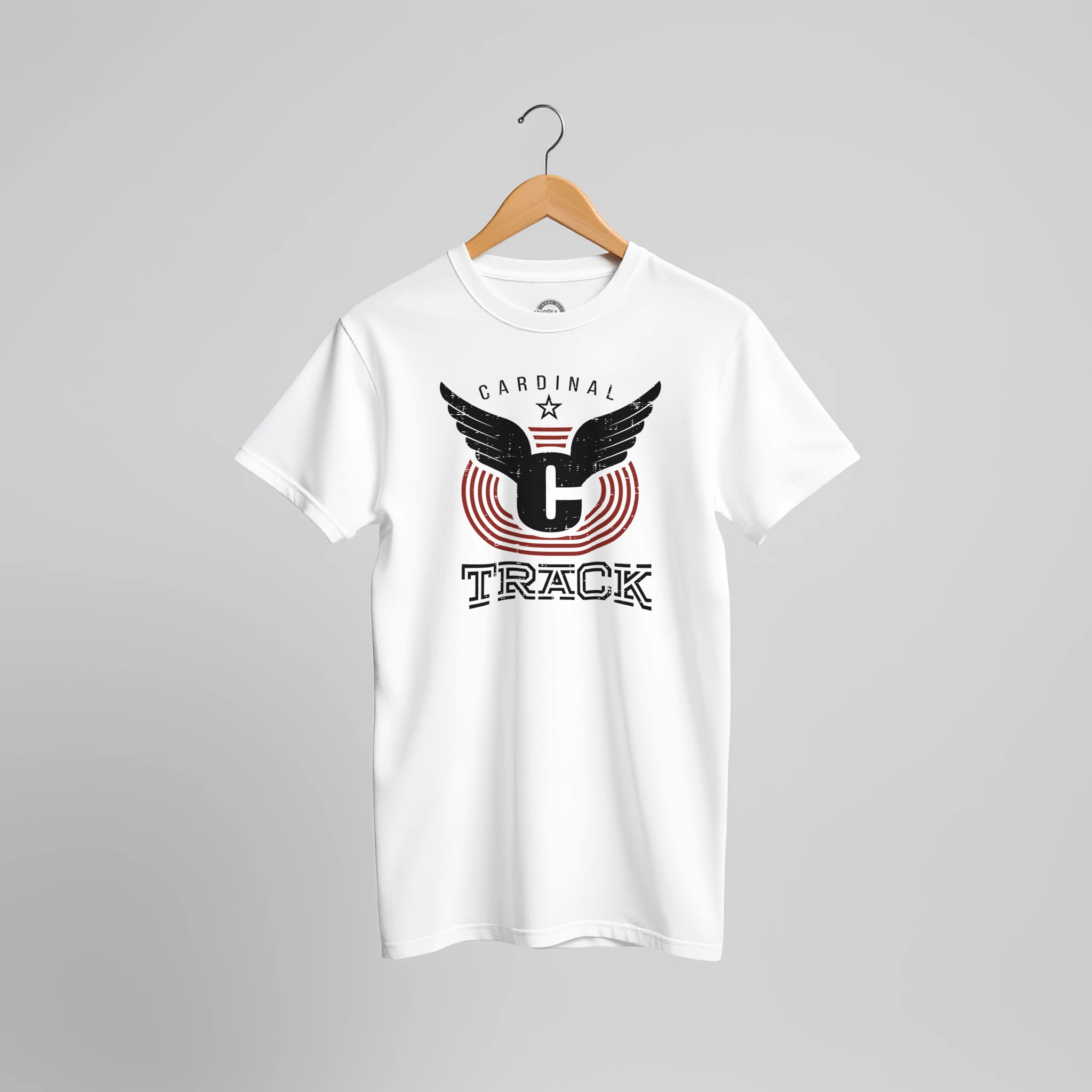 Take flight on the track. Inspired by old-school athletic department gear, this shirt combines a sleek winged-C emblem with a retro red track graphic. The “Cardinal Track” block lettering and weathered print give it an authentic, lived-in feel from day one. Perfect for runners who appreciate a heritage look.