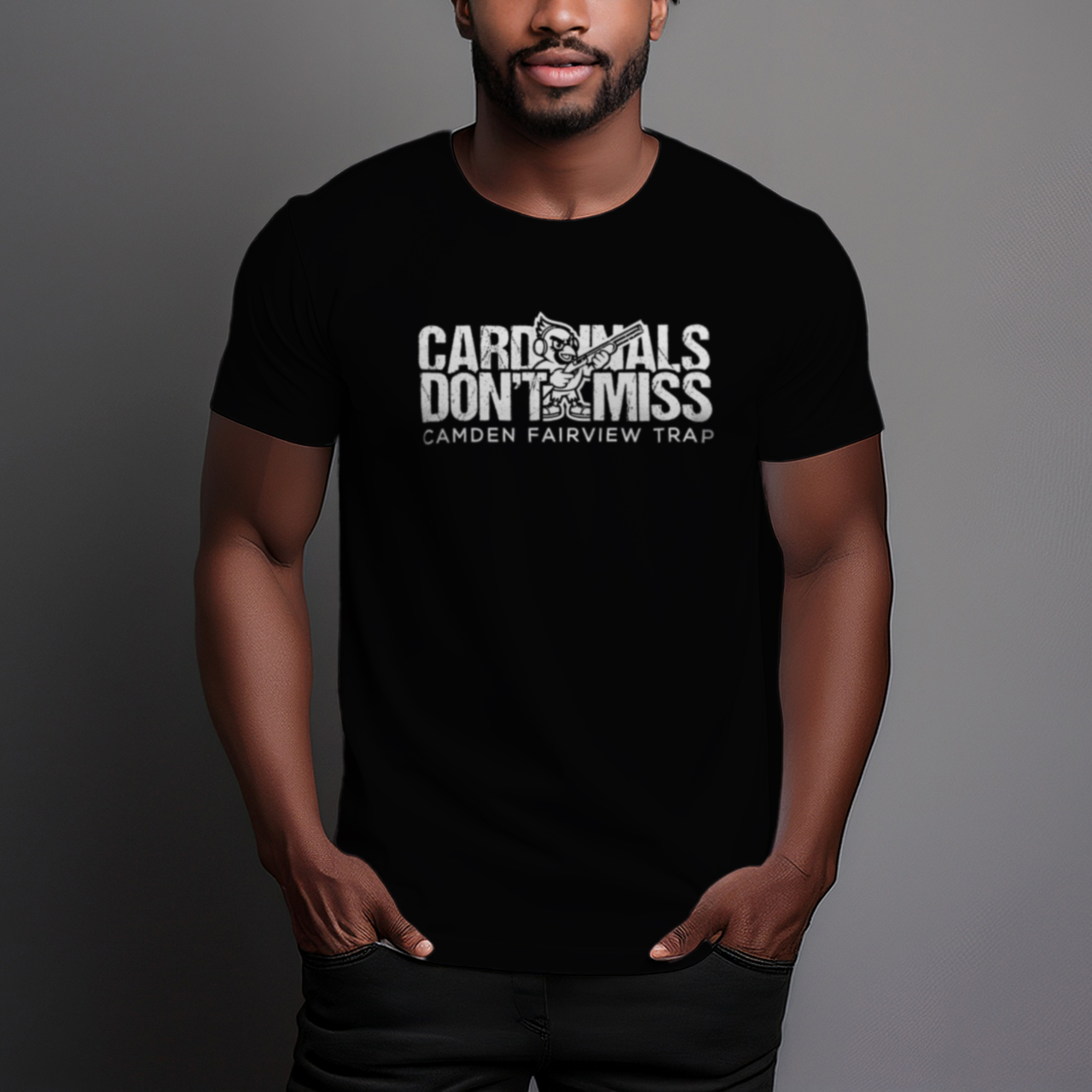 Whether you’re on the range or in the stands, represent your team with this bold, athletic-inspired design. Featuring a distressed “Cardinals Don’t Miss” graphic and a custom trap shooting mascot, this piece is built for those who value precision and team pride.