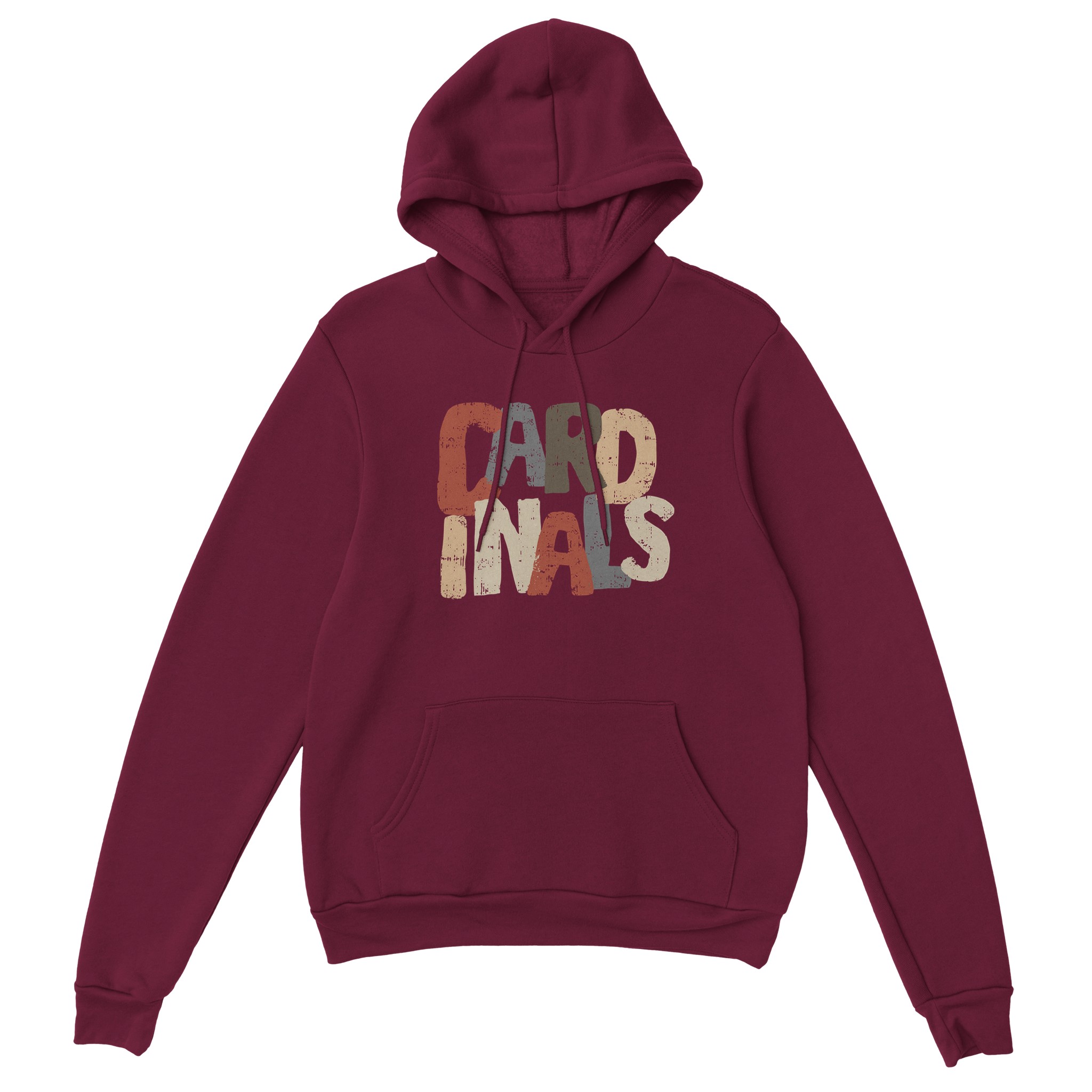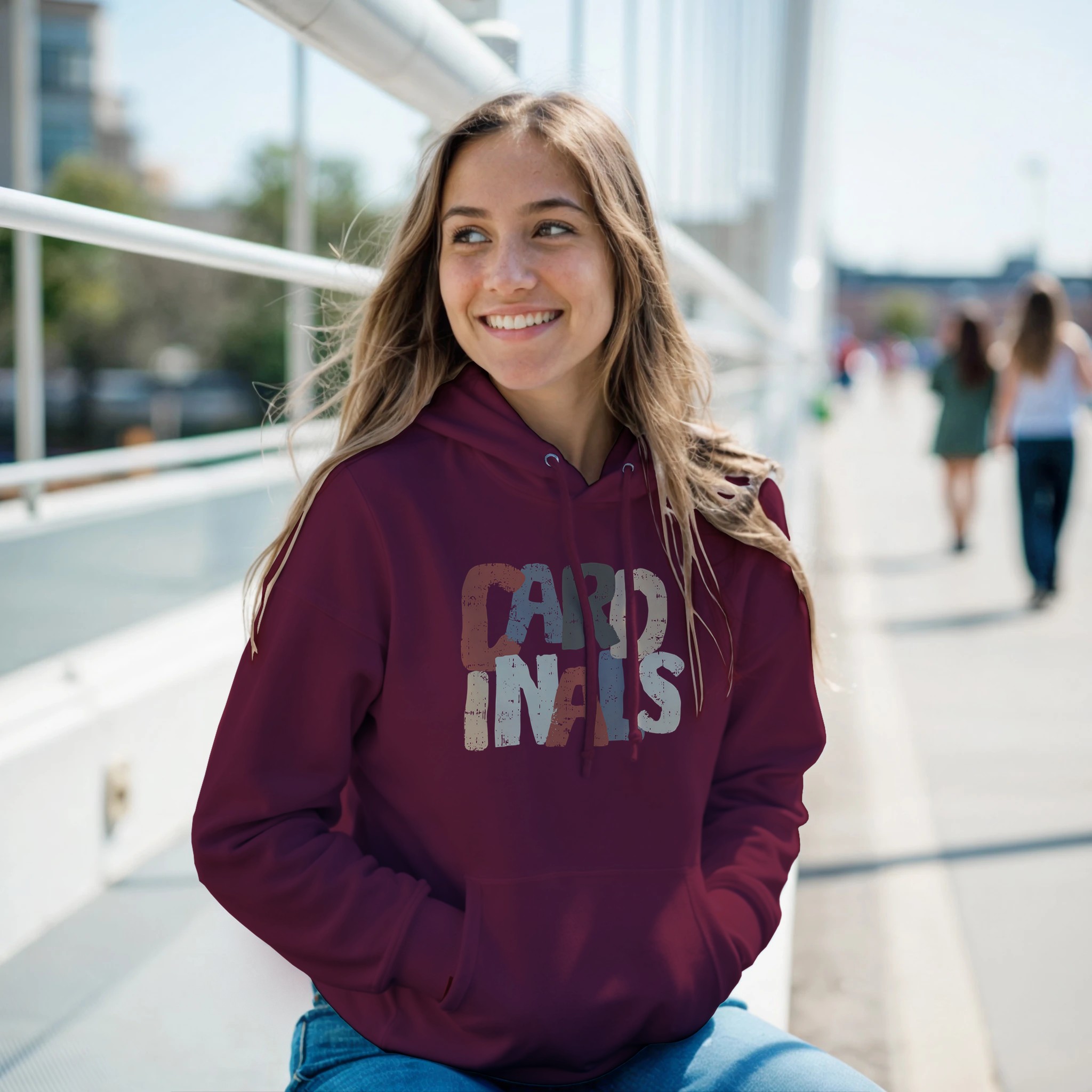 This Cardinals design brings a fun retro vibe with its stacked block lettering and distressed, multi-color print. The textured look gives it a worn-in, vintage feel that pairs perfectly with casual outfits, game days, or everyday team pride. The bold, playful layout makes it eye-catching while still keeping a classic fan-favorite style.