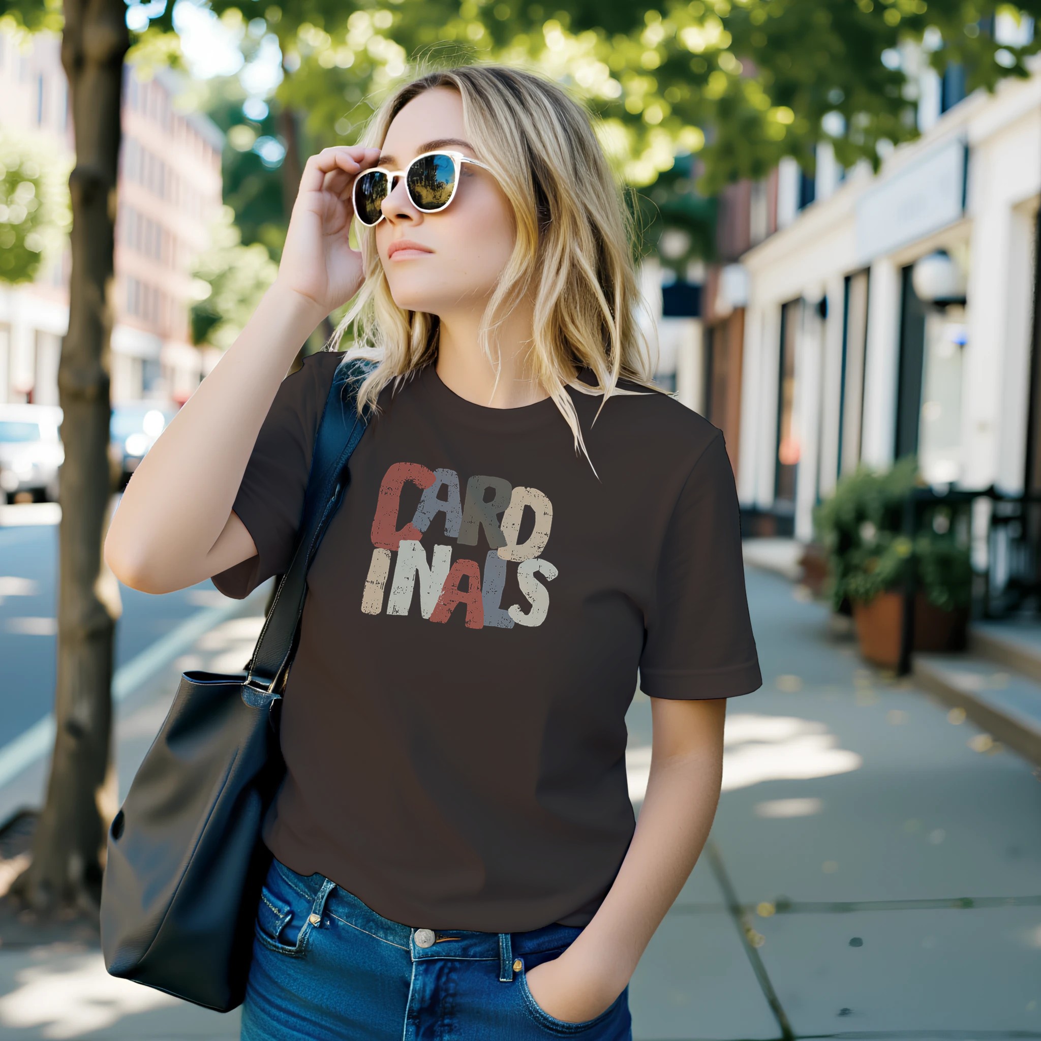 This Cardinals design brings a fun retro vibe with its stacked block lettering and distressed, multi-color print. The textured look gives it a worn-in, vintage feel that pairs perfectly with casual outfits, game days, or everyday team pride. The bold, playful layout makes it eye-catching while still keeping a classic fan-favorite style.