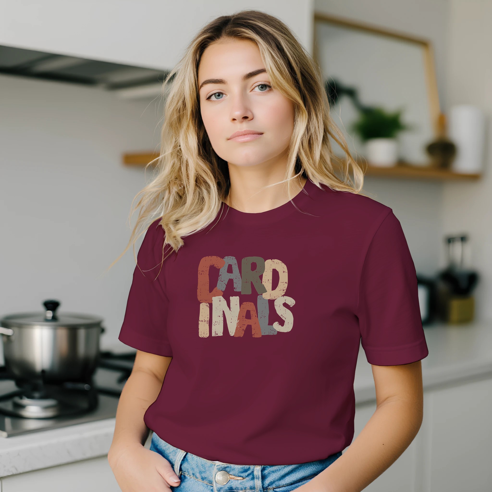 This Cardinals design brings a fun retro vibe with its stacked block lettering and distressed, multi-color print. The textured look gives it a worn-in, vintage feel that pairs perfectly with casual outfits, game days, or everyday team pride. The bold, playful layout makes it eye-catching while still keeping a classic fan-favorite style.