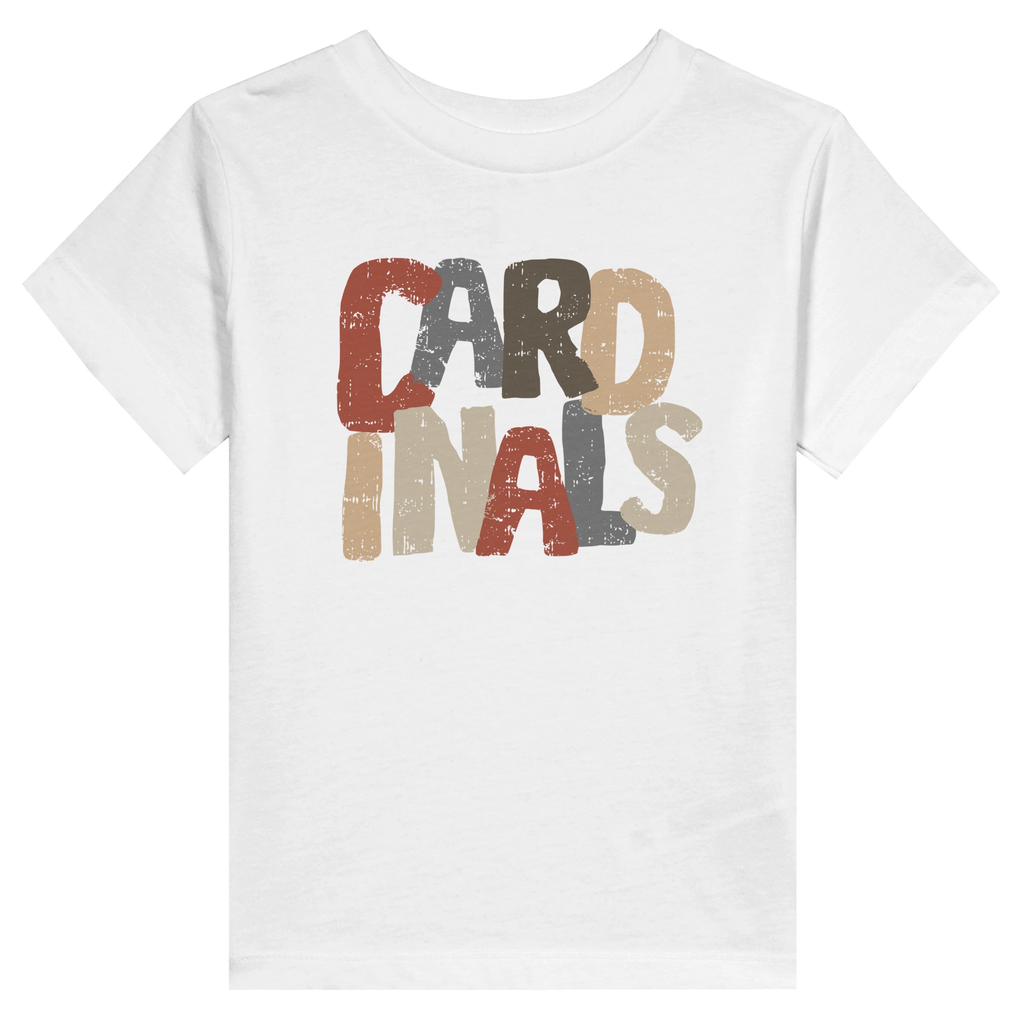 This Cardinals design brings a fun retro vibe with its stacked block lettering and distressed, multi-color print. The textured look gives it a worn-in, vintage feel that pairs perfectly with casual outfits, game days, or everyday team pride. The bold, playful layout makes it eye-catching while still keeping a classic fan-favorite style.