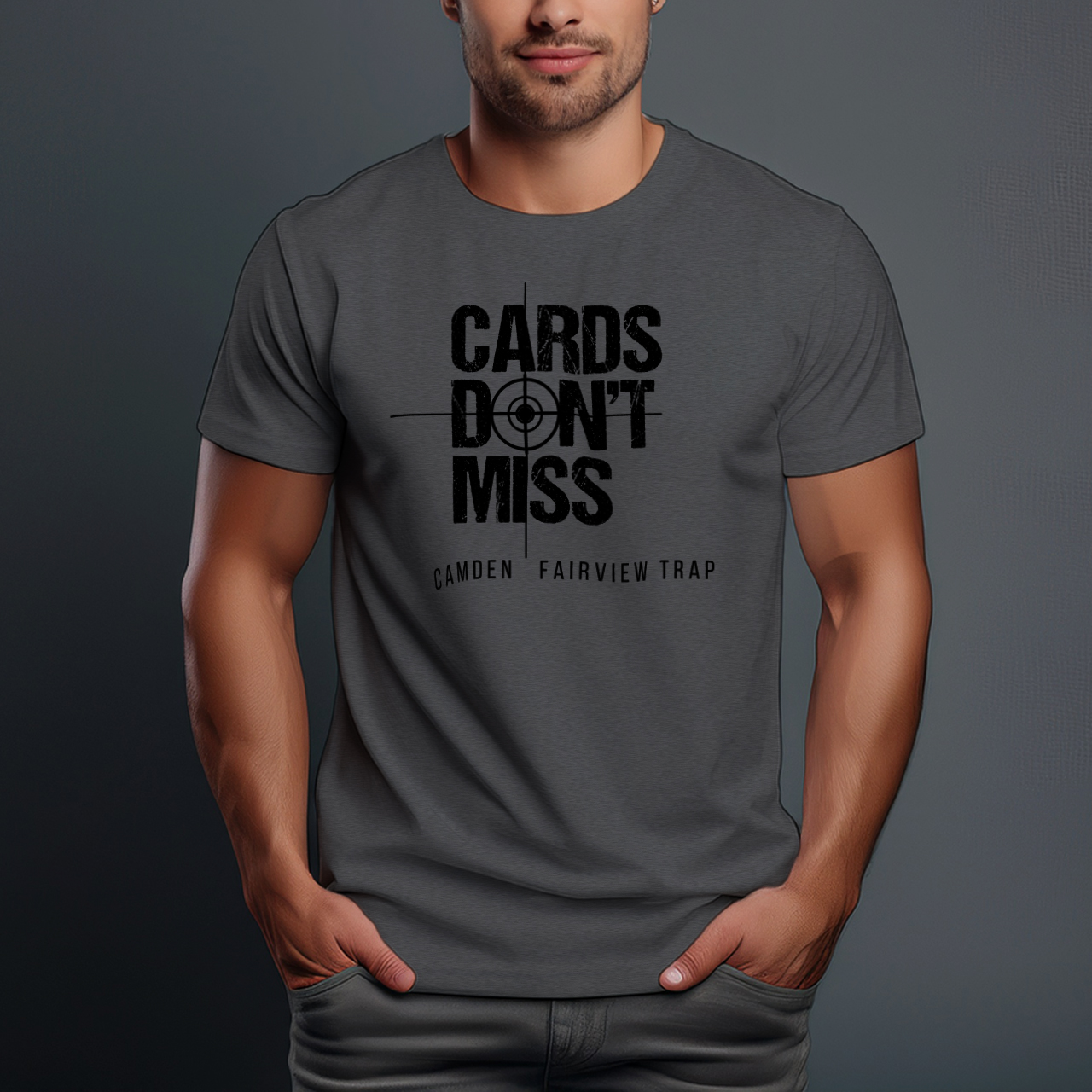 Show up to the range with a design that speaks for itself. This “Cards Don’t Miss” graphic combines bold, high-impact typography with a clean crosshair target for a look that’s as sharp as your aim. Featuring a distressed, vintage finish, it’s the ultimate way for athletes and supporters to represent their team.