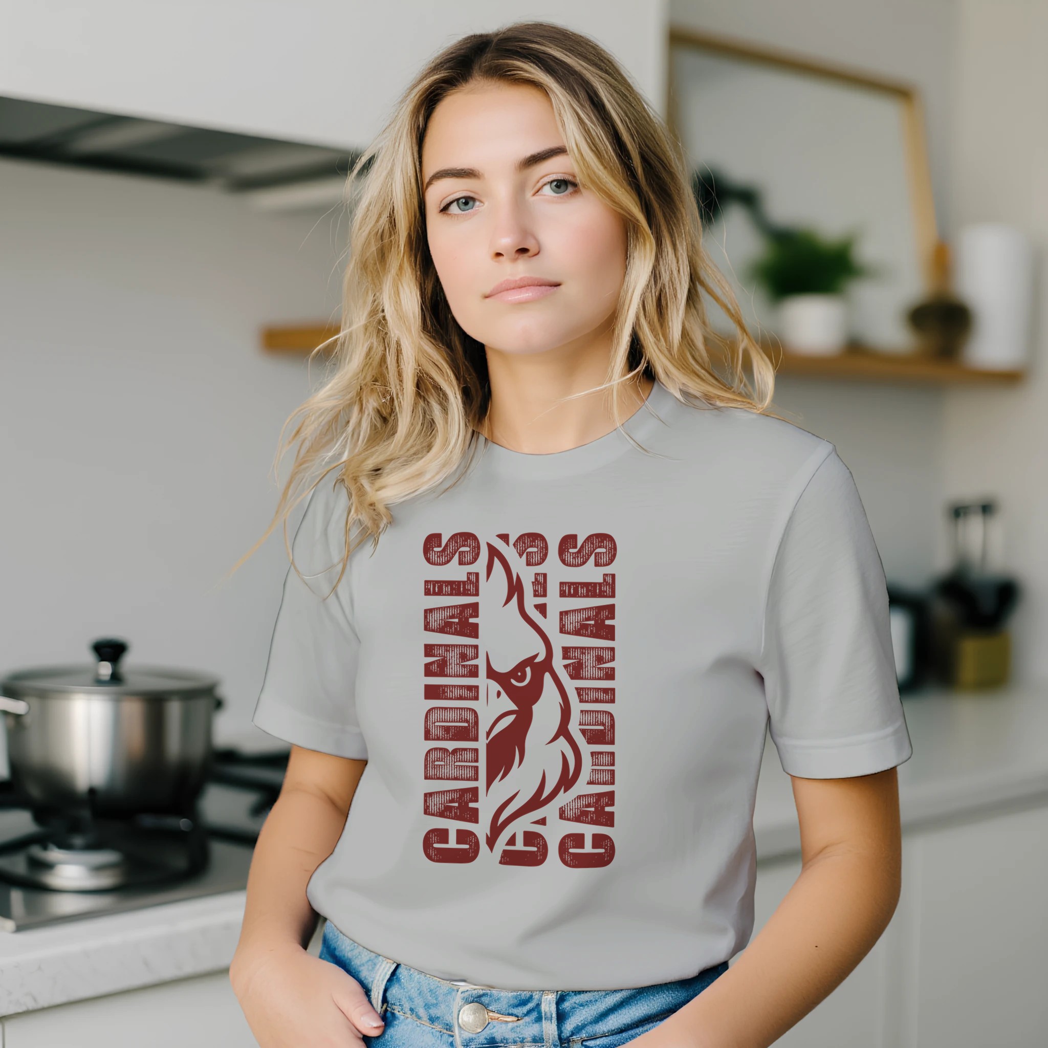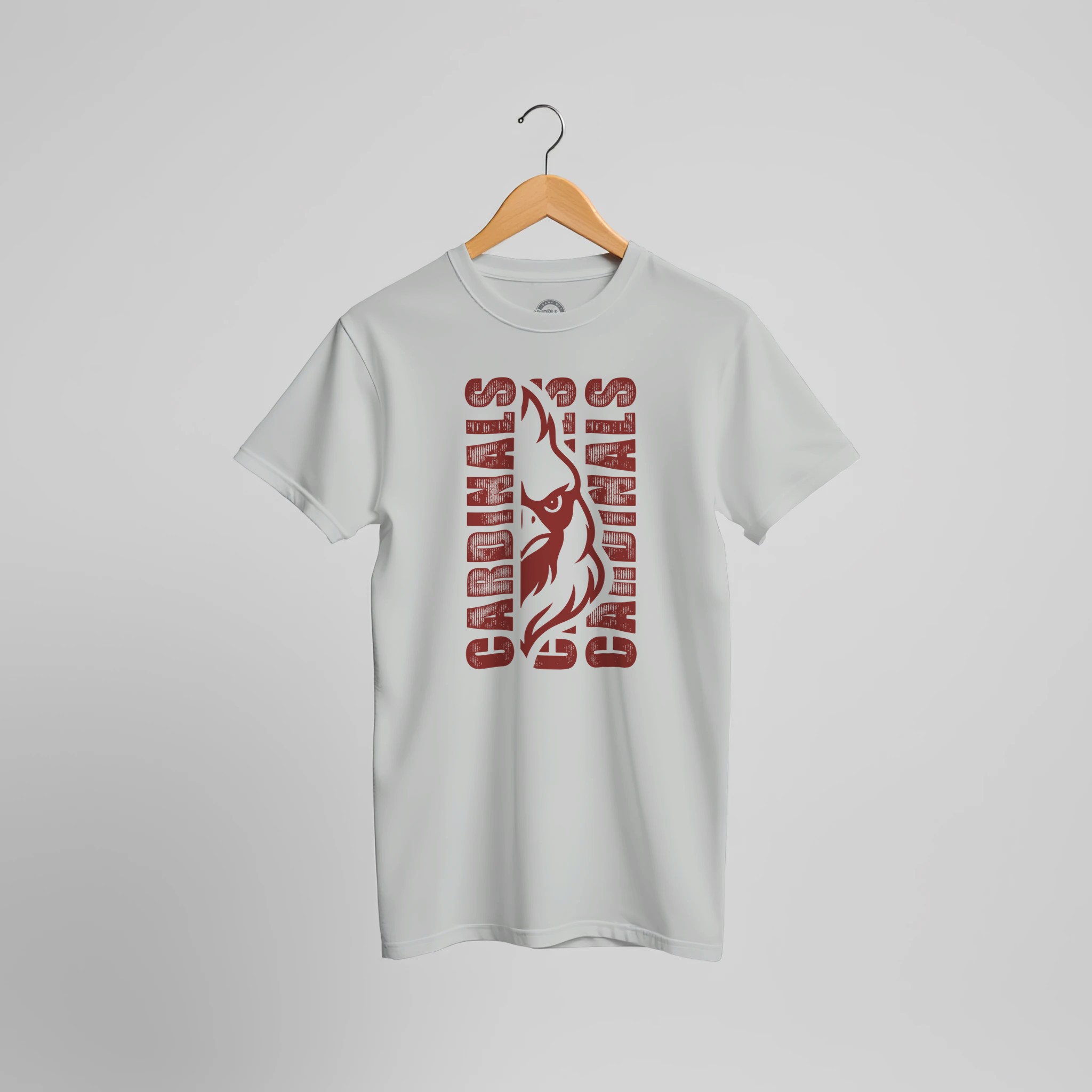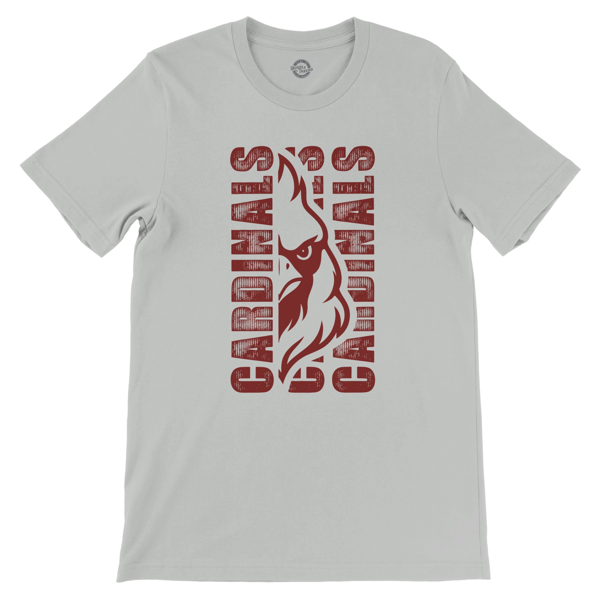 Show your Cardinals spirit with our bold, classic team design!  The centerpiece showcases a fierce cardinal mascot head with powerful detailing, flanked by “CARDINALS” text on both sides in a vintage-inspired, distressed font that gives this shirt an authentic, time-honored feel.This is the perfect shirt to stand out in the crowd on game day or show your team loyalty around town. The distressed lettering adds character and a touch of tradition, honoring the legacy of Cardinals pride.