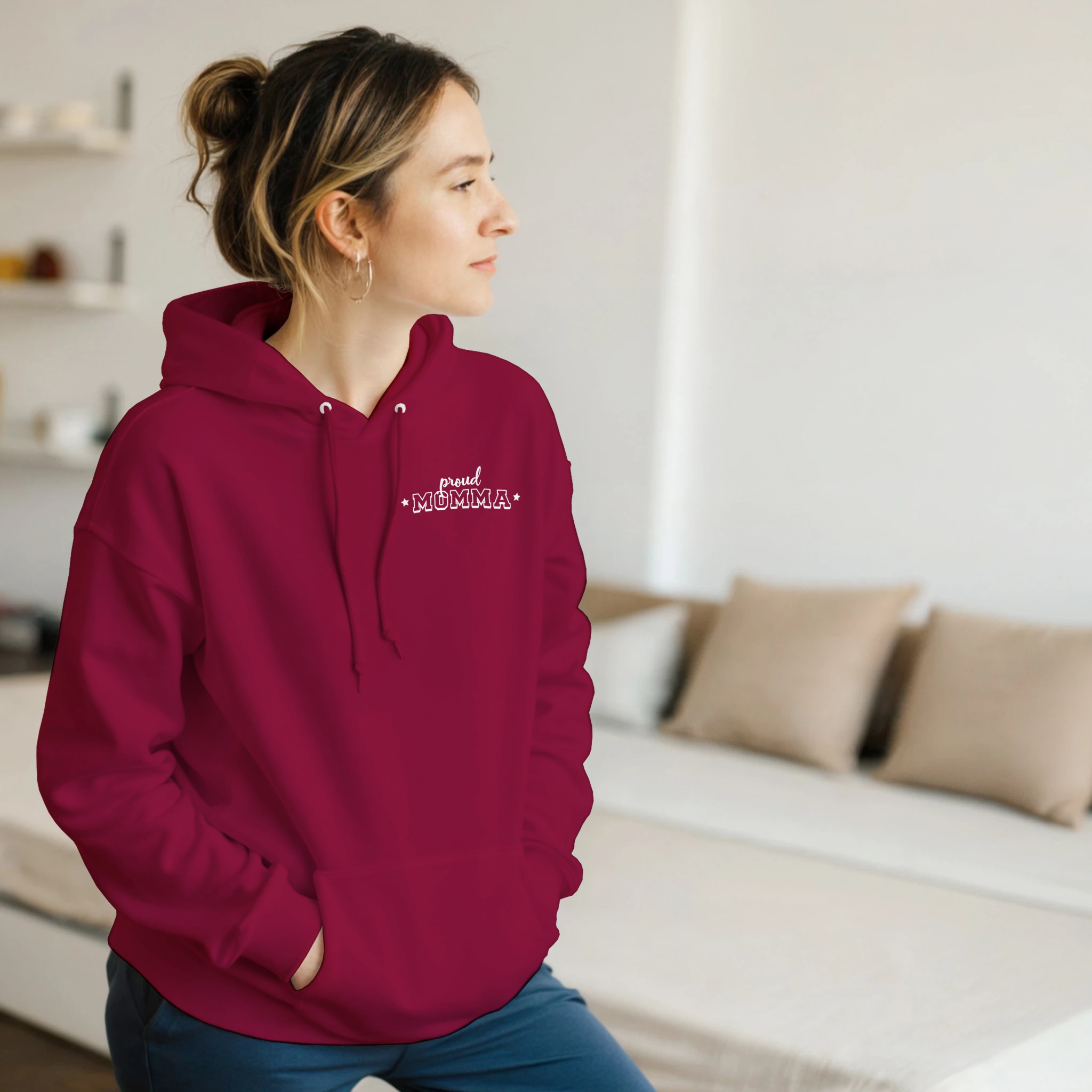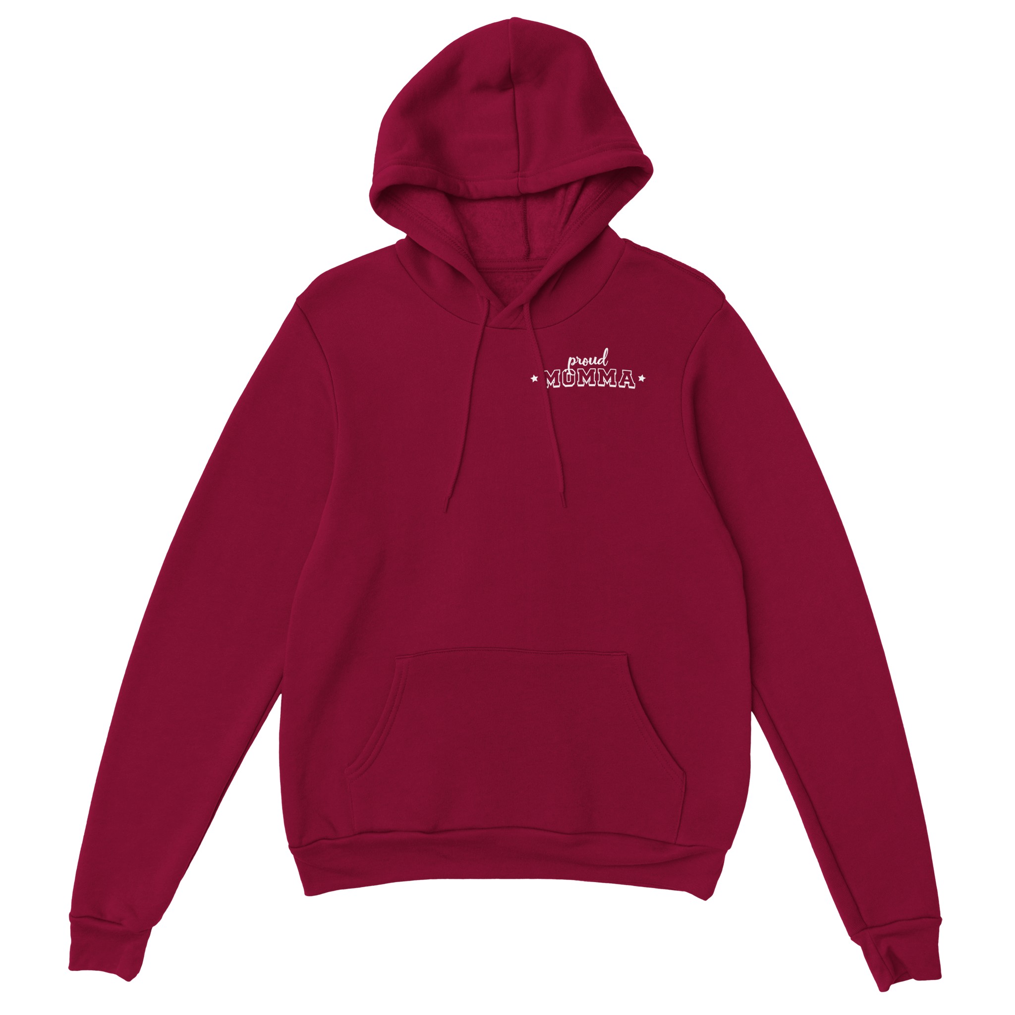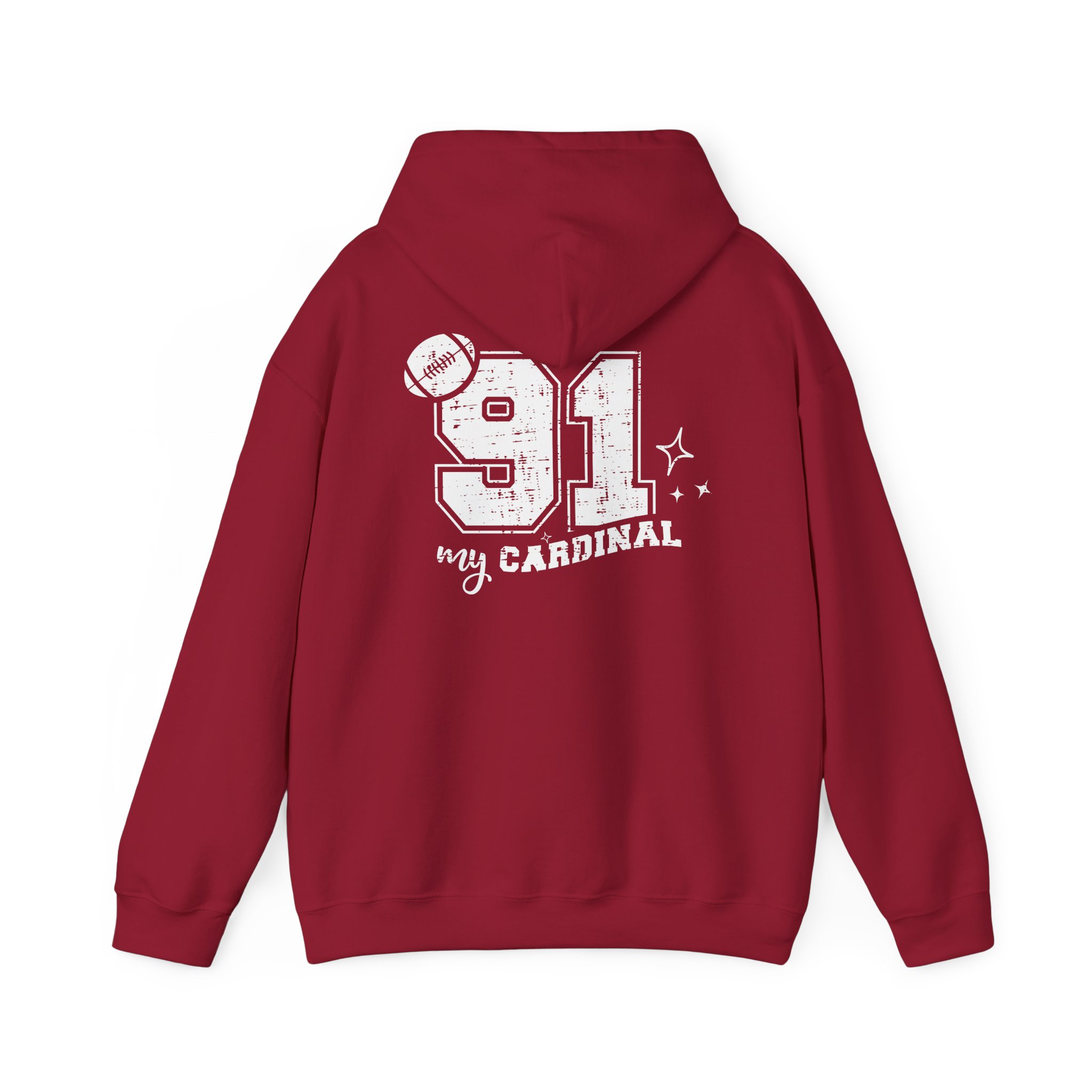 This hoodie celebrates the special bond between a Cardinal mom and her player with a thoughtfully designed front-and-back layout. The front features a subtle yet meaningful “proud MOMMA” designation on the left chest, accented with delicate stars – a tasteful way to wear your heart without saying too much. Turn around to reveal the showstopper – your player’s number in a large, vintage-distressed font with striking visual impact. Below, ” MY CARDINAL” flows in an elegant script that adds a touch of feminine style to this team spirit essential. Decorative star accents complete the look, adding just the right amount of sparkle to match your Cardinal pride.