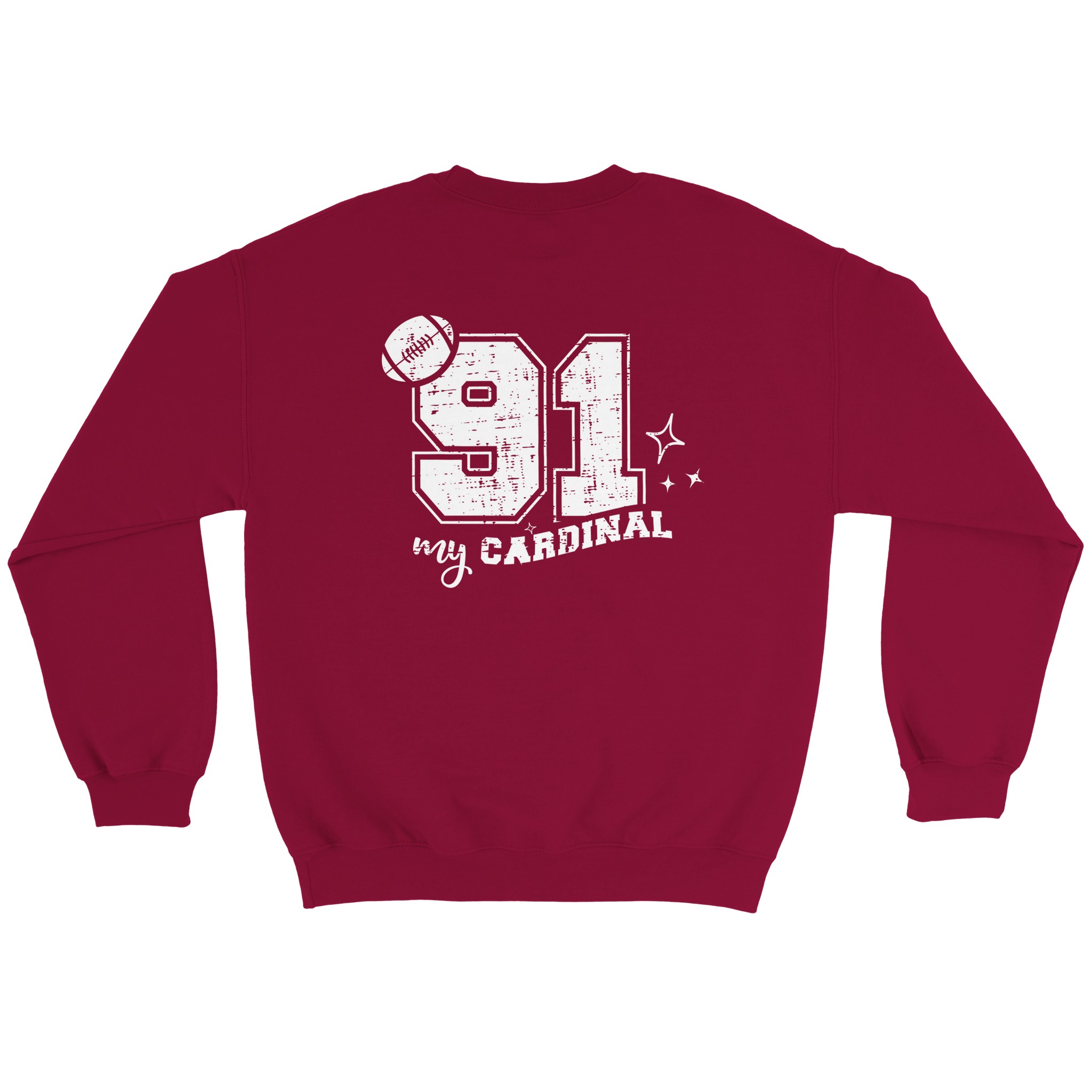 This sweatshirt celebrates the special bond between a Cardinal mom and her player with a thoughtfully designed front-and-back layout. The front features a subtle yet meaningful “proud MOMMA” designation on the left chest, accented with delicate stars – a tasteful way to wear your heart without saying too much. Turn around to reveal the showstopper – your player’s number in a large, vintage-distressed font with striking visual impact. Below, ” MY CARDINAL” flows in an elegant script that adds a touch of feminine style to this team spirit essential. Decorative star accents complete the look, adding just the right amount of sparkle to match your Cardinal pride.