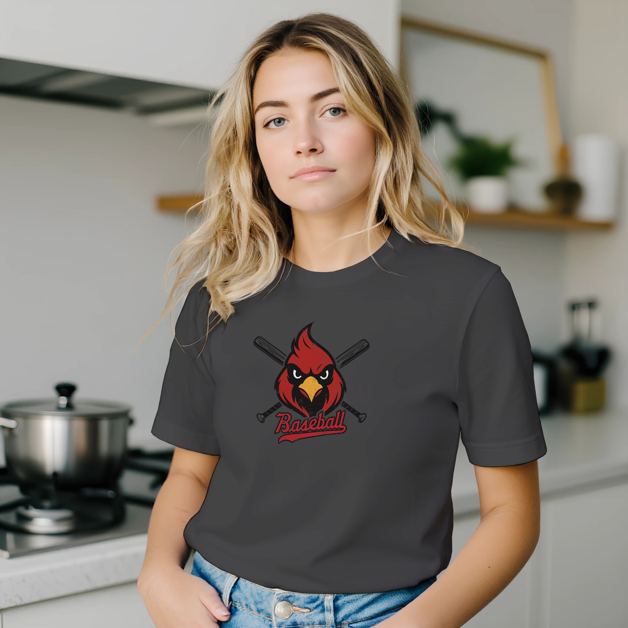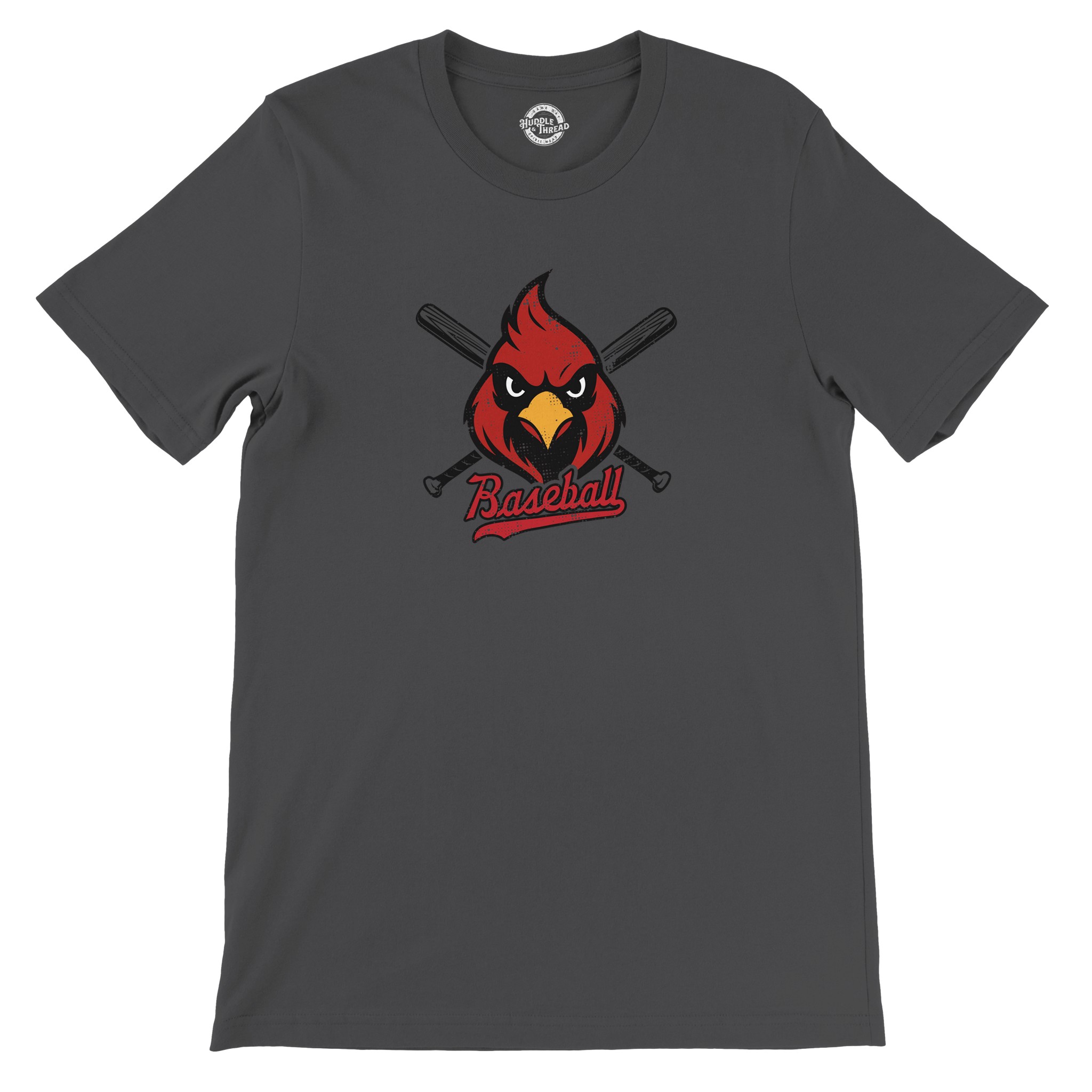 This Cardinal Baseball tee delivers a bold, spirited look that stands out on and off the field. The design features a fierce red cardinal mascot centered between crossed baseball bats, giving it a strong, competitive feel perfect for players, parents, and fans. The script “Baseball” tail logo adds a classic sports touch and finishes the design with a clean, vintage vibe.