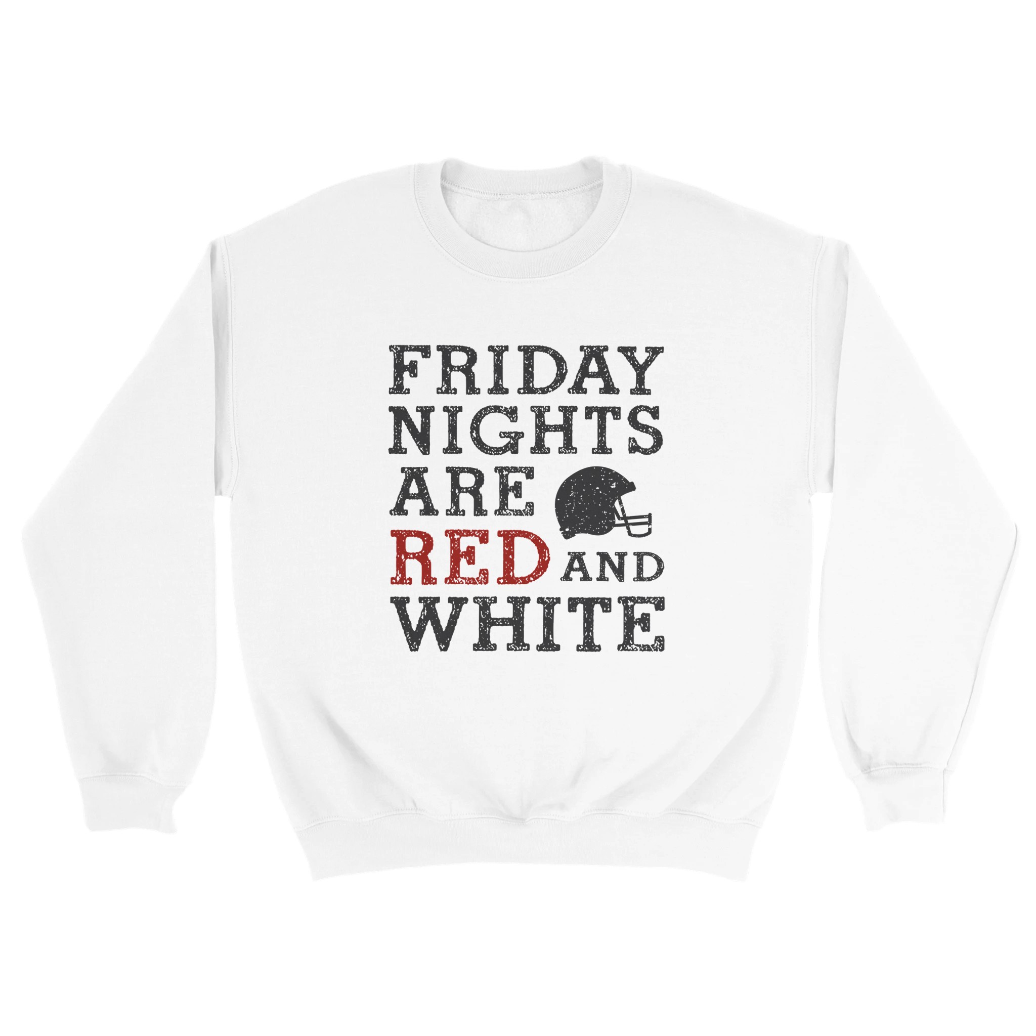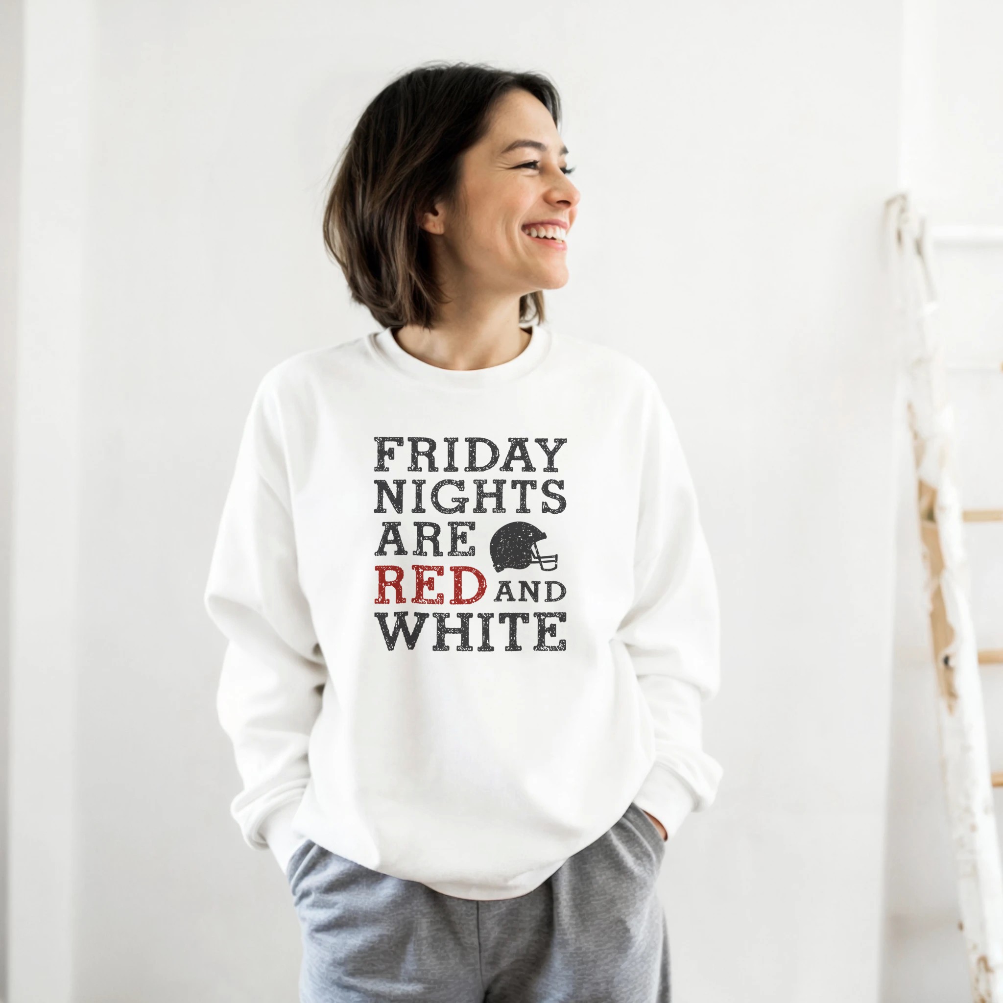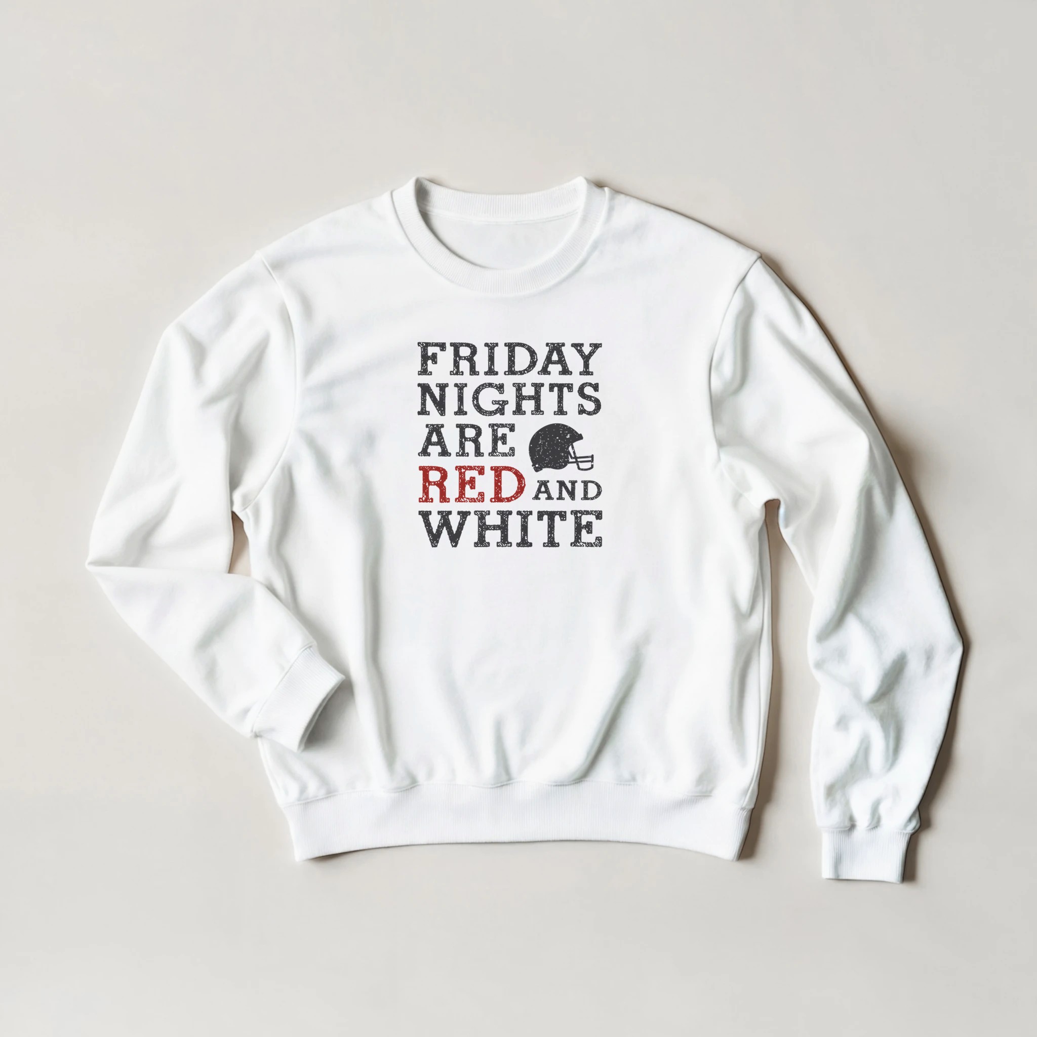 This sweatshirt captures the electric atmosphere and deep tradition of Cardinal football game nights with a bold, vintage-inspired design. The centerpiece proudly declares “FRIDAY NIGHTS ARE RED AND WHITE” in powerful distressed typography, with “RED” highlighted in vibrant team color for maximum impact. A classic football helmet silhouette is thoughtfully integrated into the design, symbolizing the heart of Friday night football tradition. The intentionally weathered, textured finish gives this shirt an authentic, battle-tested look that shows you’ve been supporting through countless seasons under those Friday night lights. This isn’t just team apparel – it’s a declaration of community pride and football tradition that spans generations.