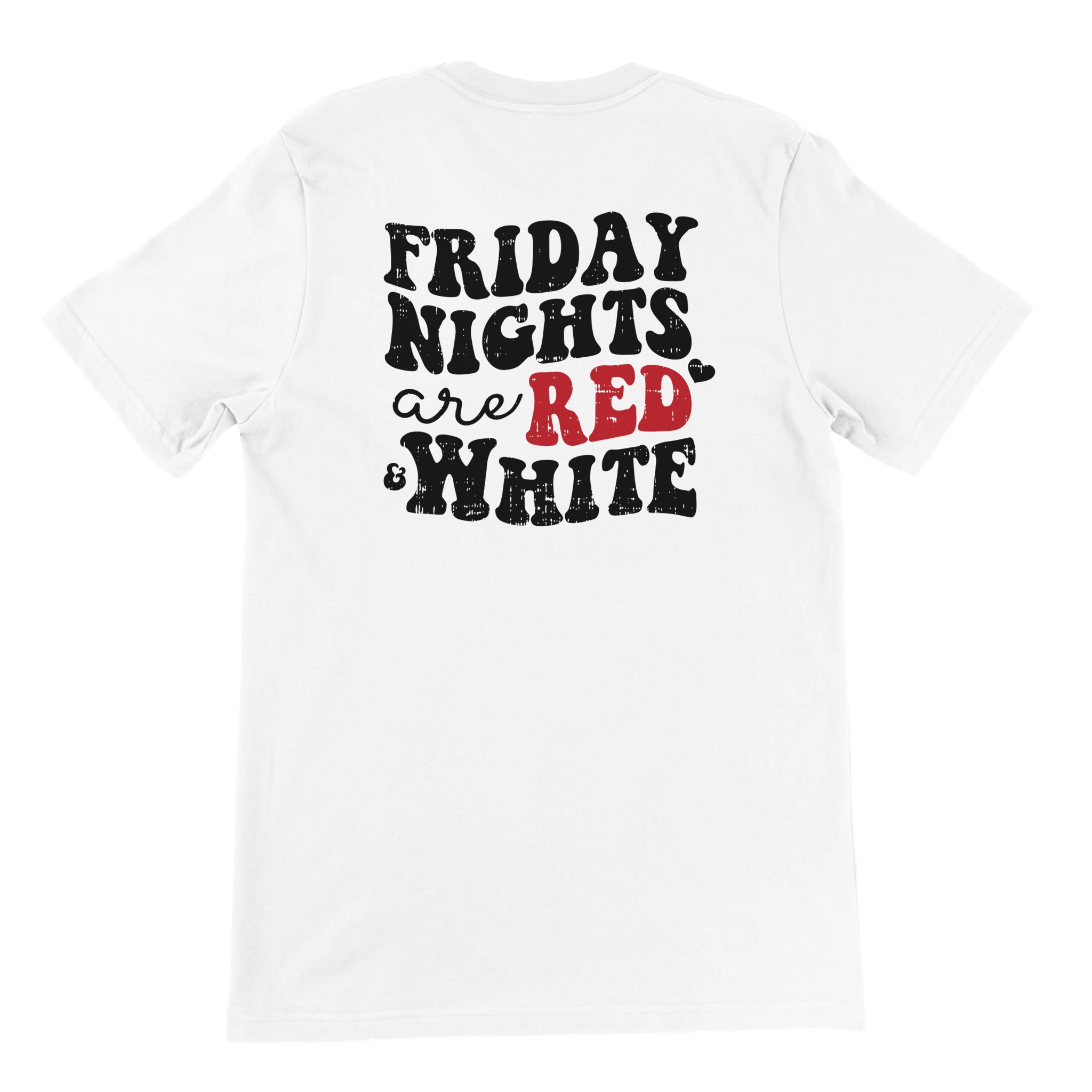 This t-shirt celebrates Cardinal football passion with thoughtful details on both front and back. The front features a subtle yet meaningful left chest design – a classic football outline with authentic stitching detail and a small heart at its center, perfectly symbolizing your love for the game and your team in one elegant emblem. Turn around to reveal the showstopper – a bold back design that proudly declares “FRIDAY NIGHTS ARE RED & WHITE” in powerful stacked typography with eye-catching outline effects. “RED” stands out in vibrant team color, while playful heart accents add a touch of charm that reinforces the passion behind your Cardinal pride.