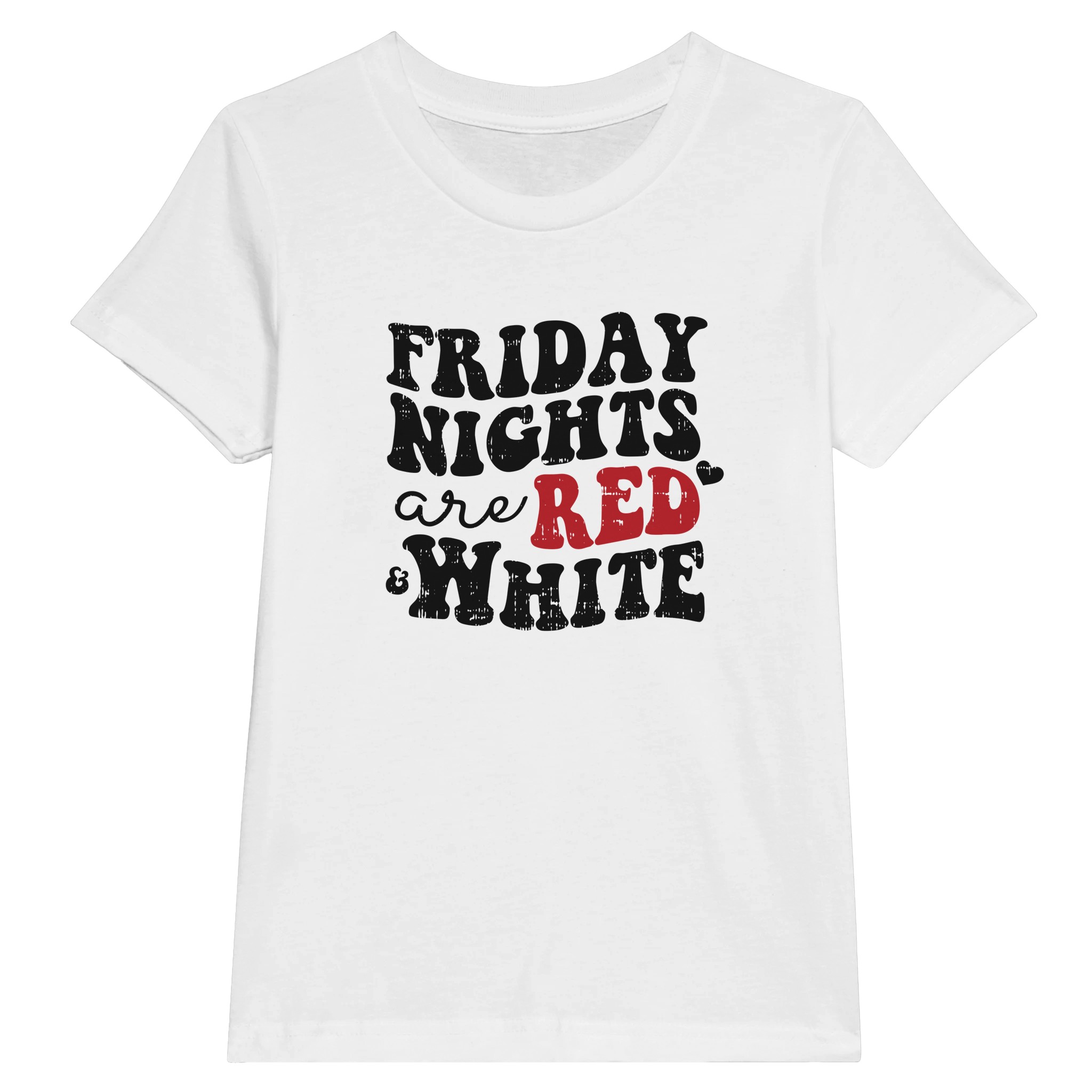 This t-shirt celebrates Cardinal football passion with thoughtful details. The bold back design proudly declares “FRIDAY NIGHTS ARE RED & WHITE” in powerful stacked typography. “RED” stands out in vibrant team color, flanked by charming heart accents that reinforce the passion behind your Cardinal pride.