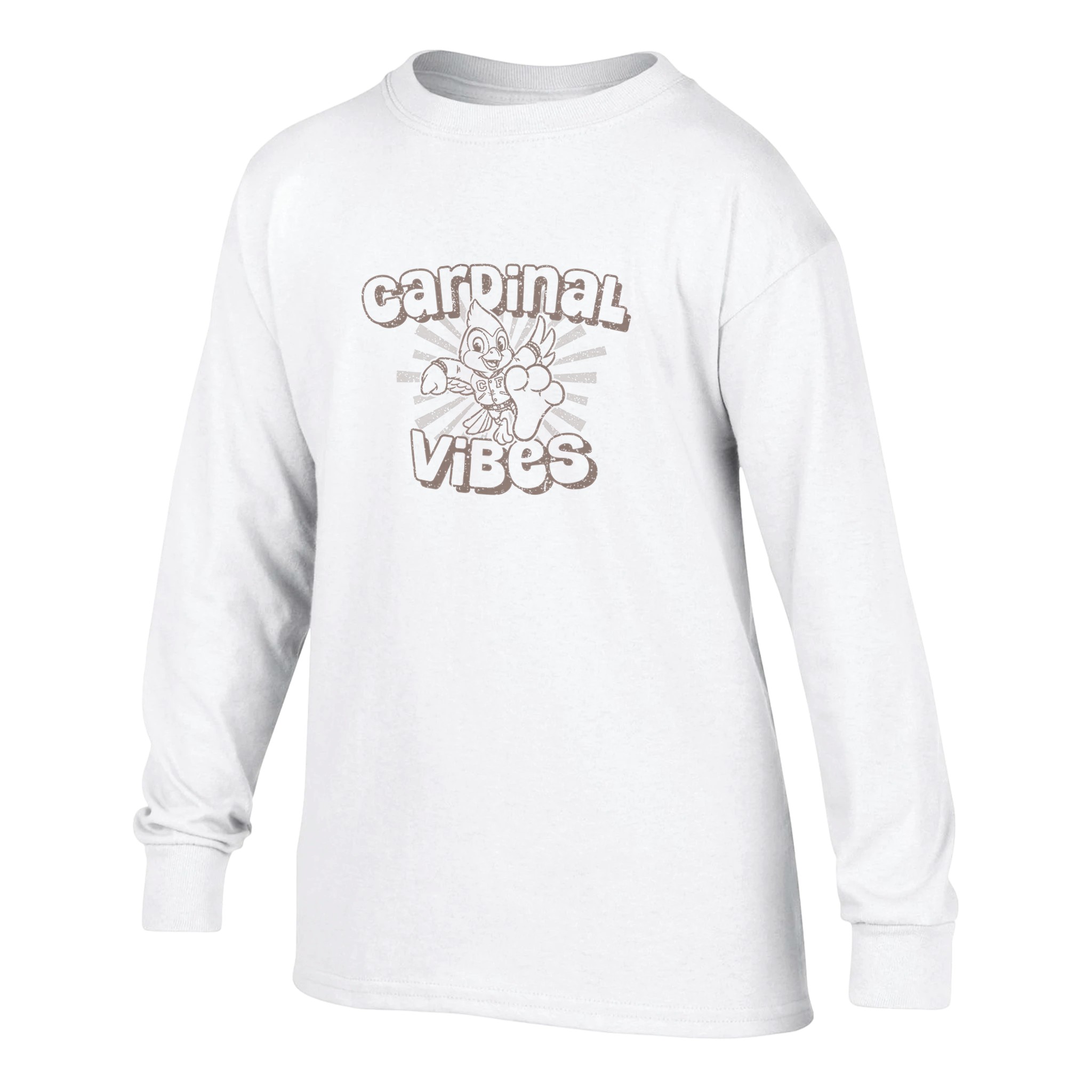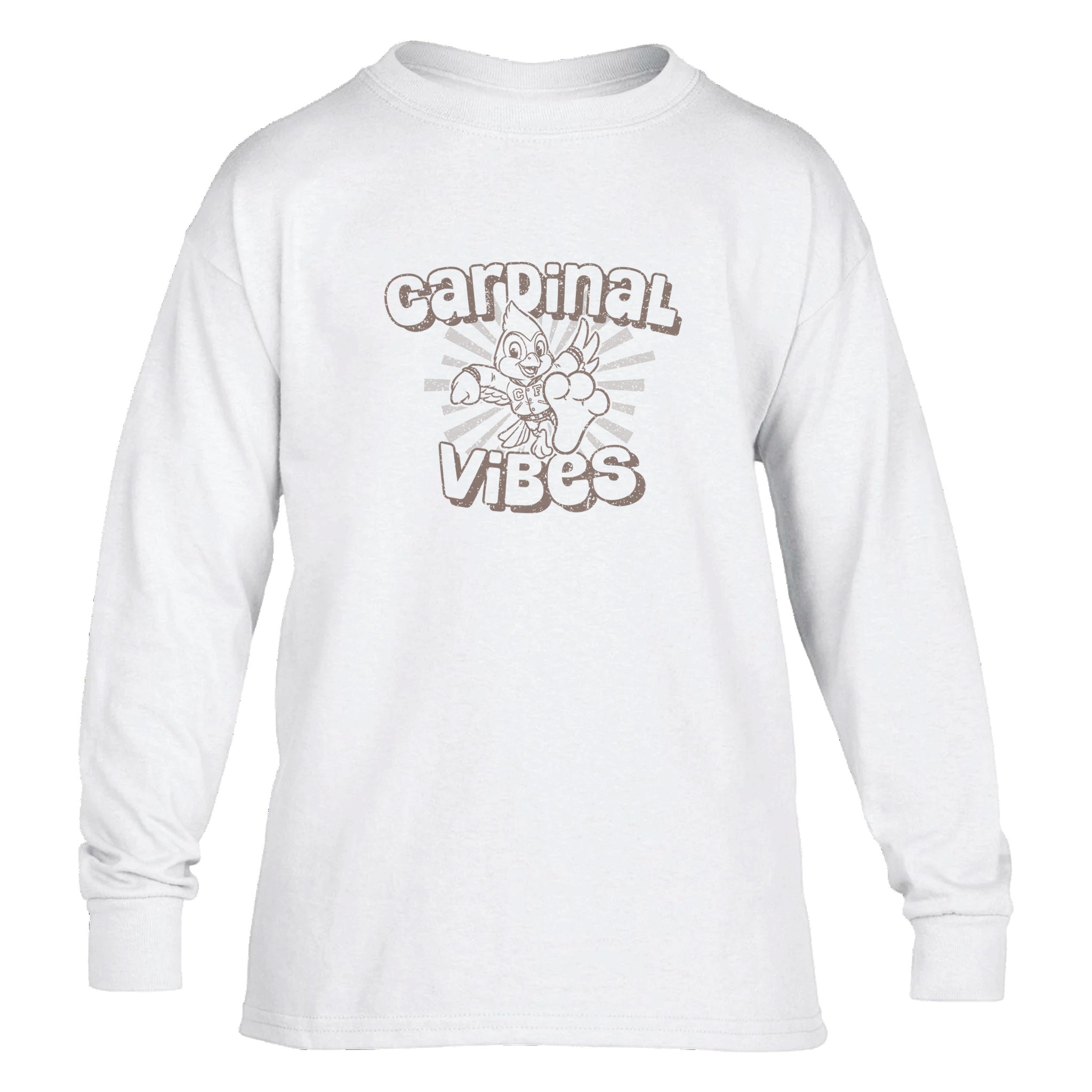 This t-shirt features a delightfully retro design that celebrates Cardinal pride with a nostalgic twist. The centerpiece showcases the classic Cardinal mascot character in a dynamic, action-packed pose – wings spread wide and ready for victory! This cheerful character sports a vintage “CF” vest, connecting today’s fans to generations of Cardinal tradition.