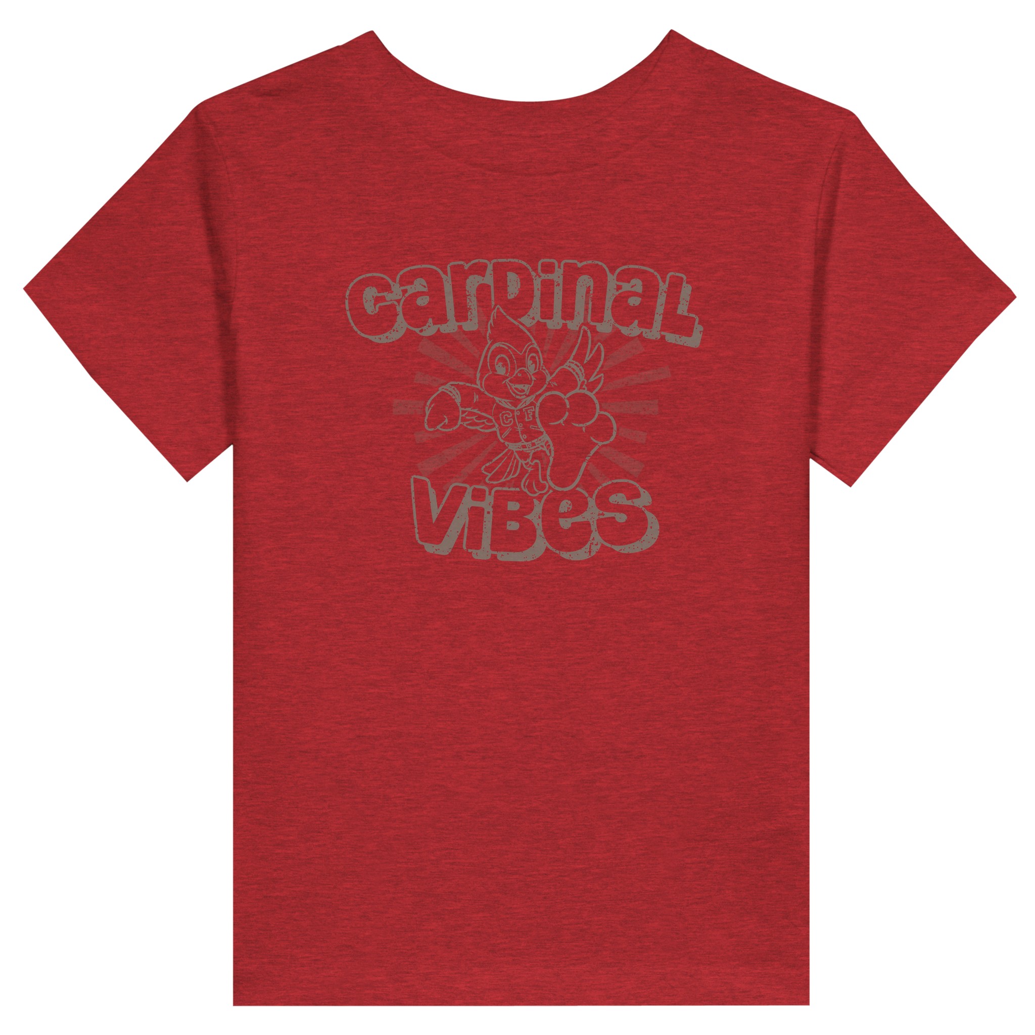 This t-shirt features a delightfully retro design that celebrates Cardinal pride with a nostalgic twist. The centerpiece showcases the classic Cardinal mascot character in a dynamic, action-packed pose – wings spread wide and ready for victory! This cheerful character sports a vintage “CF” vest, connecting today’s fans to generations of Cardinal tradition.