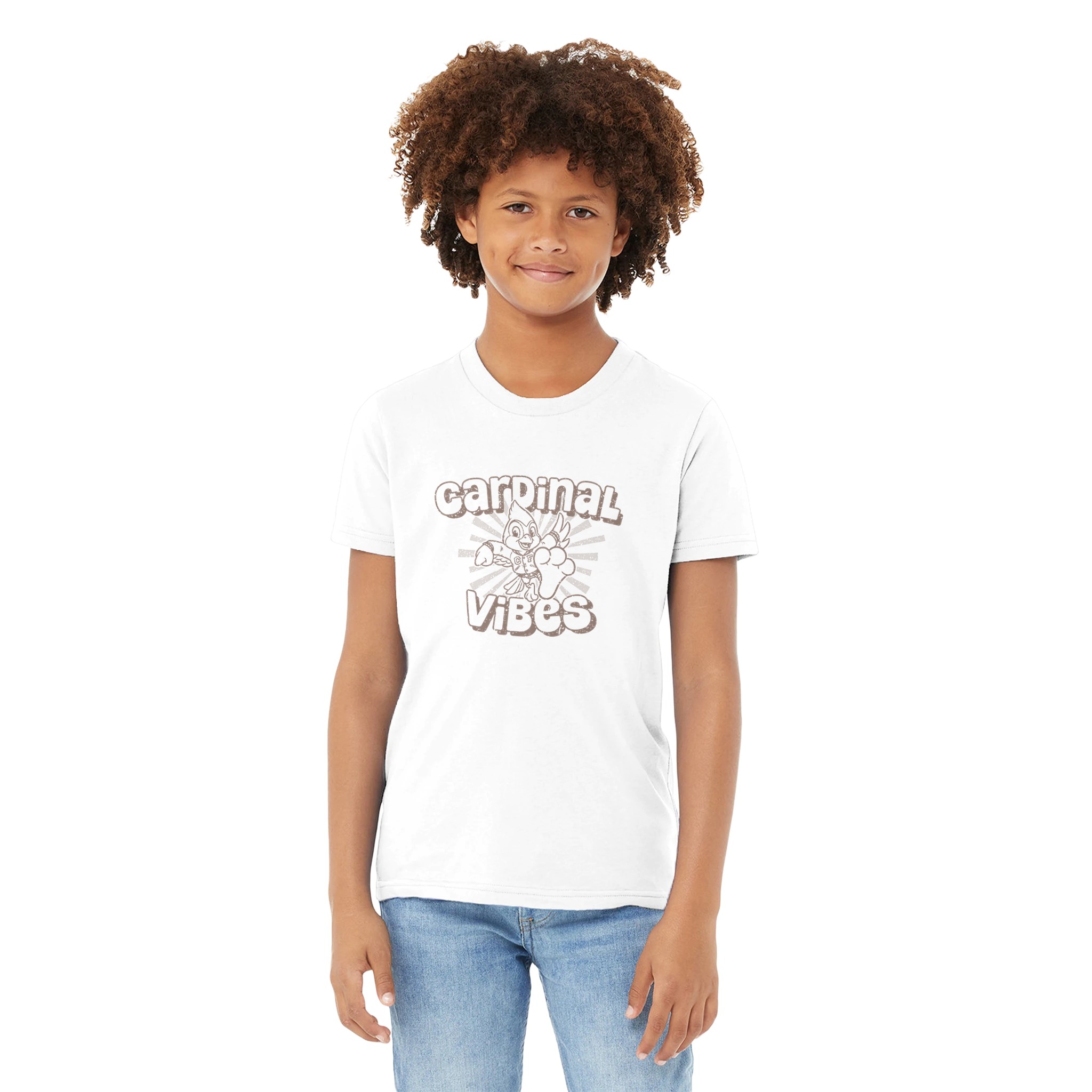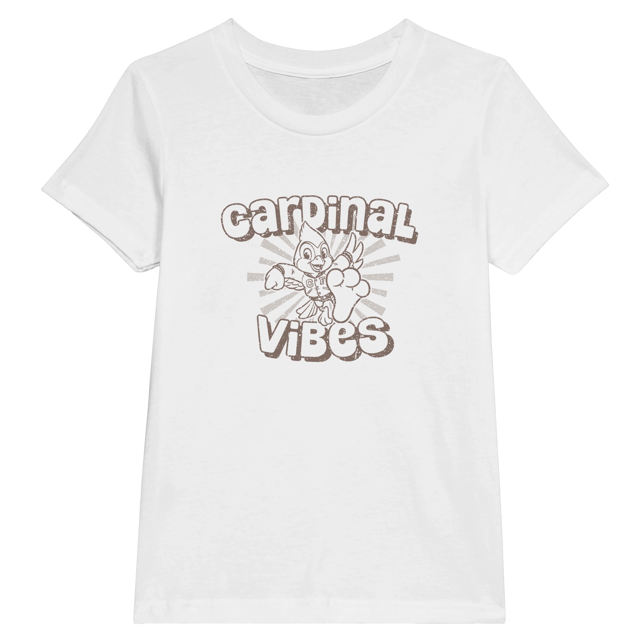 This t-shirt features a delightfully retro design that celebrates Cardinal pride with a nostalgic twist. The centerpiece showcases the classic Cardinal mascot character in a dynamic, action-packed pose – wings spread wide and ready for victory! This cheerful character sports a vintage “CF” vest, connecting today’s fans to generations of Cardinal tradition.