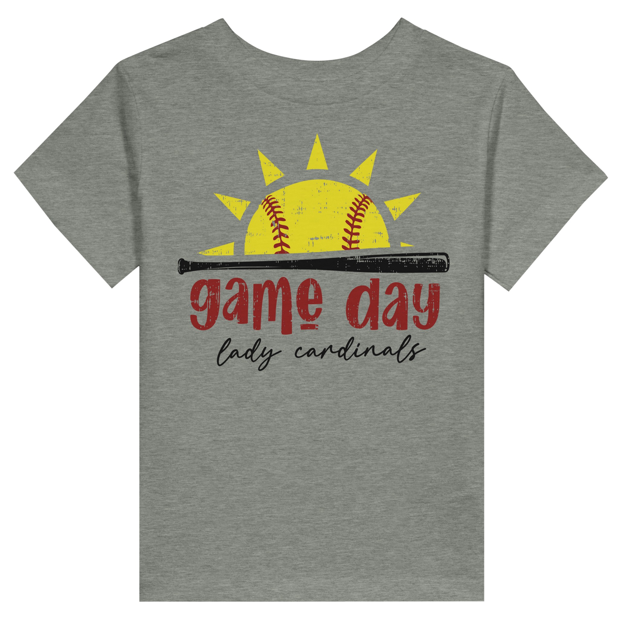 Wake up ready to win with the Lady Cardinals Game Day tee. This design features a vibrant yellow softball rising like a sun behind a sleek black bat, symbolizing the energy of a new day on the diamond. With its bold red “Game Day” lettering and elegant “Lady Cardinals” script, this shirt is the ultimate way to start your game-day ritual.