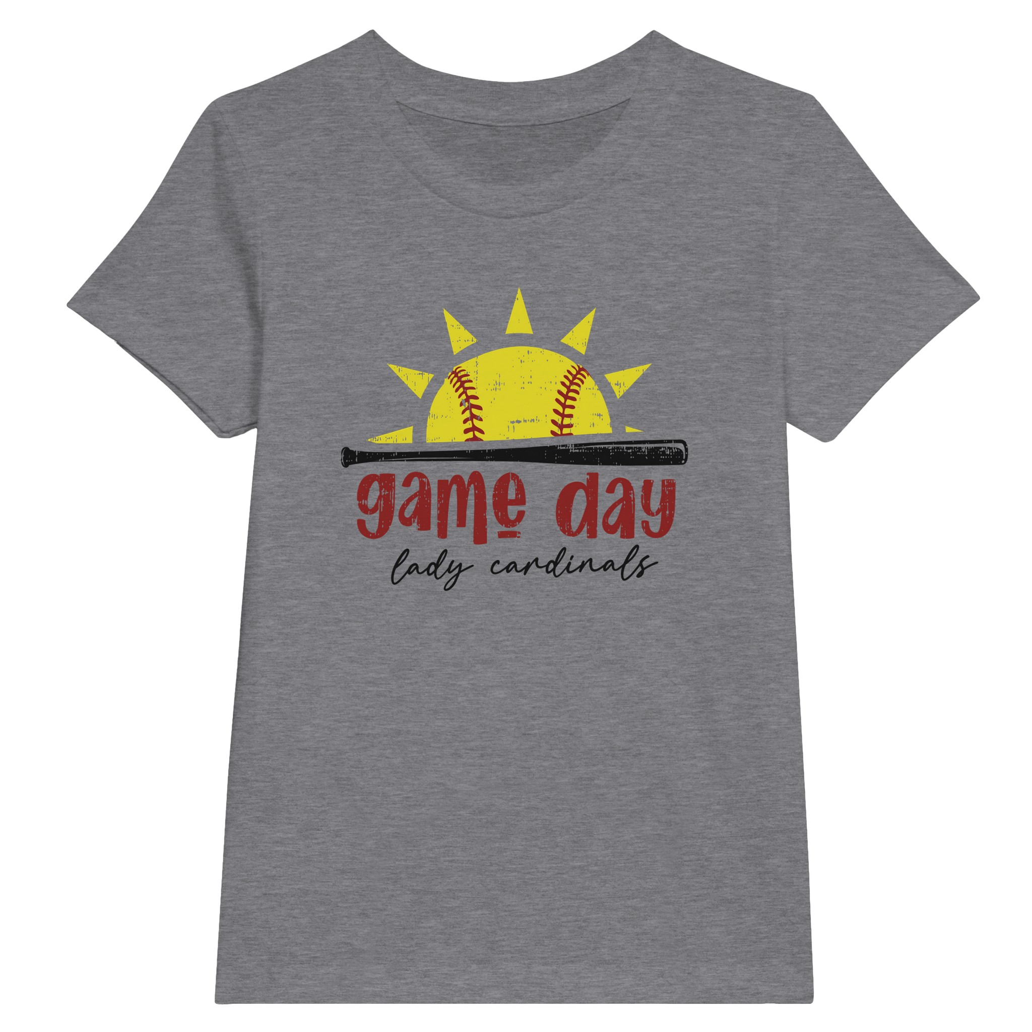Wake up ready to win with the Lady Cardinals Game Day tee. This design features a vibrant yellow softball rising like a sun behind a sleek black bat, symbolizing the energy of a new day on the diamond. With its bold red “Game Day” lettering and elegant “Lady Cardinals” script, this shirt is the ultimate way to start your game-day ritual.
