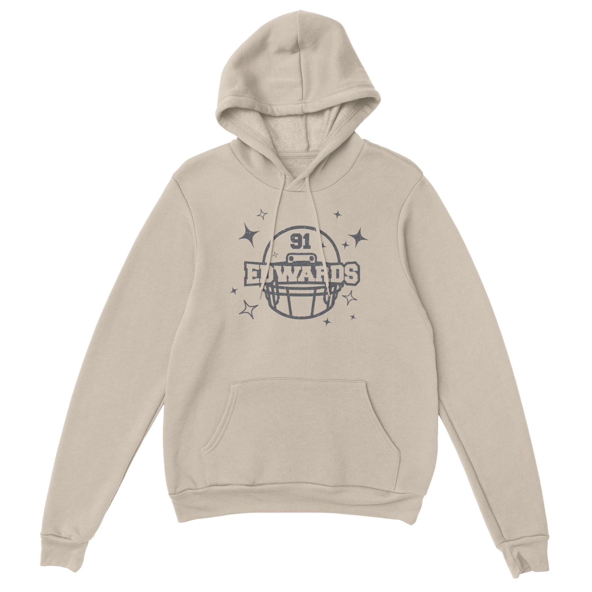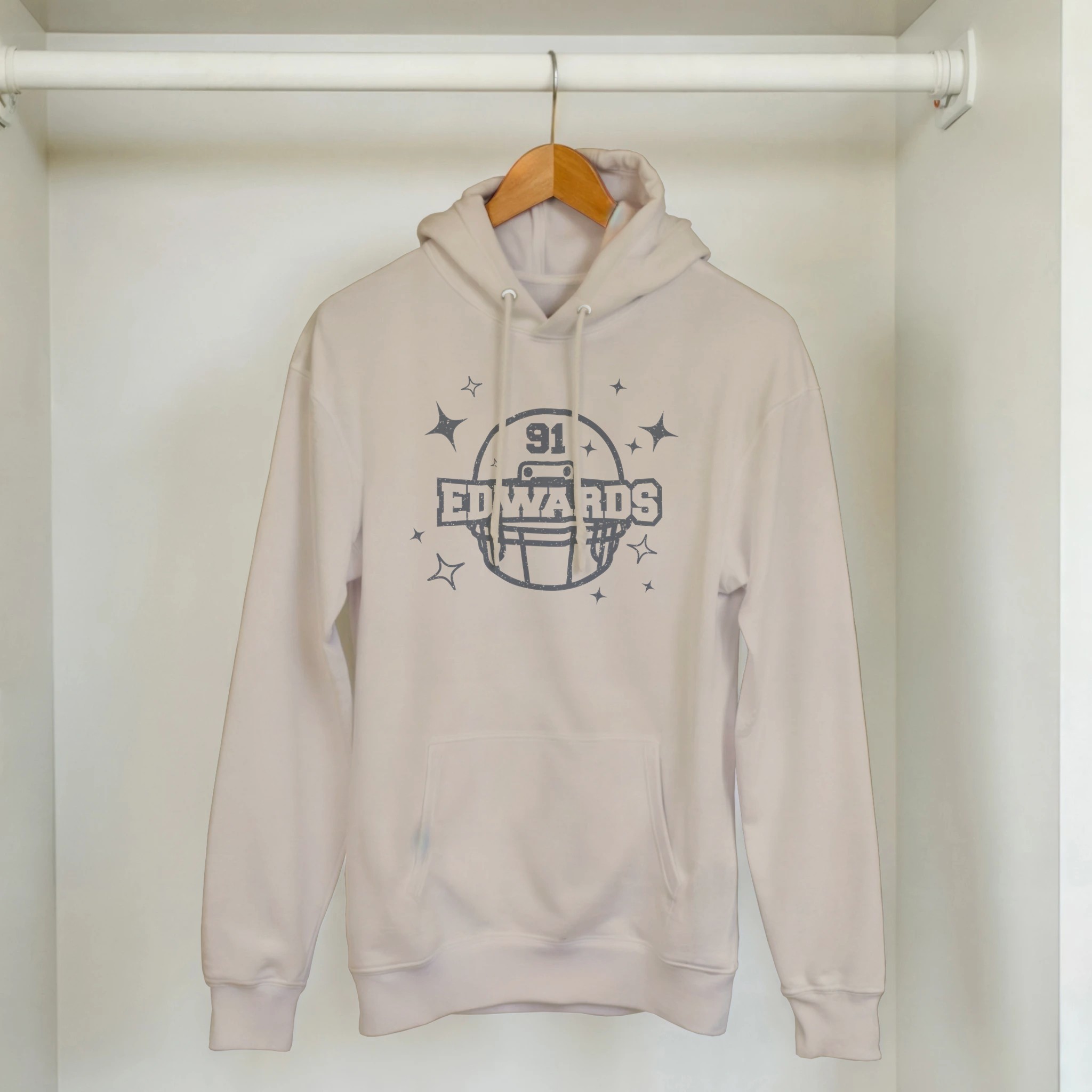 This hoodie features a vintage-inspired design that celebrates football tradition and personal pride. The centerpiece showcases a classic football helmet – a timeless symbol of the gridiron – personalized with your player’s name boldly displayed across the front and their number prominently positioned above. The intentionally distressed, weathered finish gives this shirt an authentic, time-honored look that feels like it’s been a lucky game day favorite for seasons. Decorative distressed stars surround the central emblem, adding classic athletic flair to this personalized tribute hoodie.