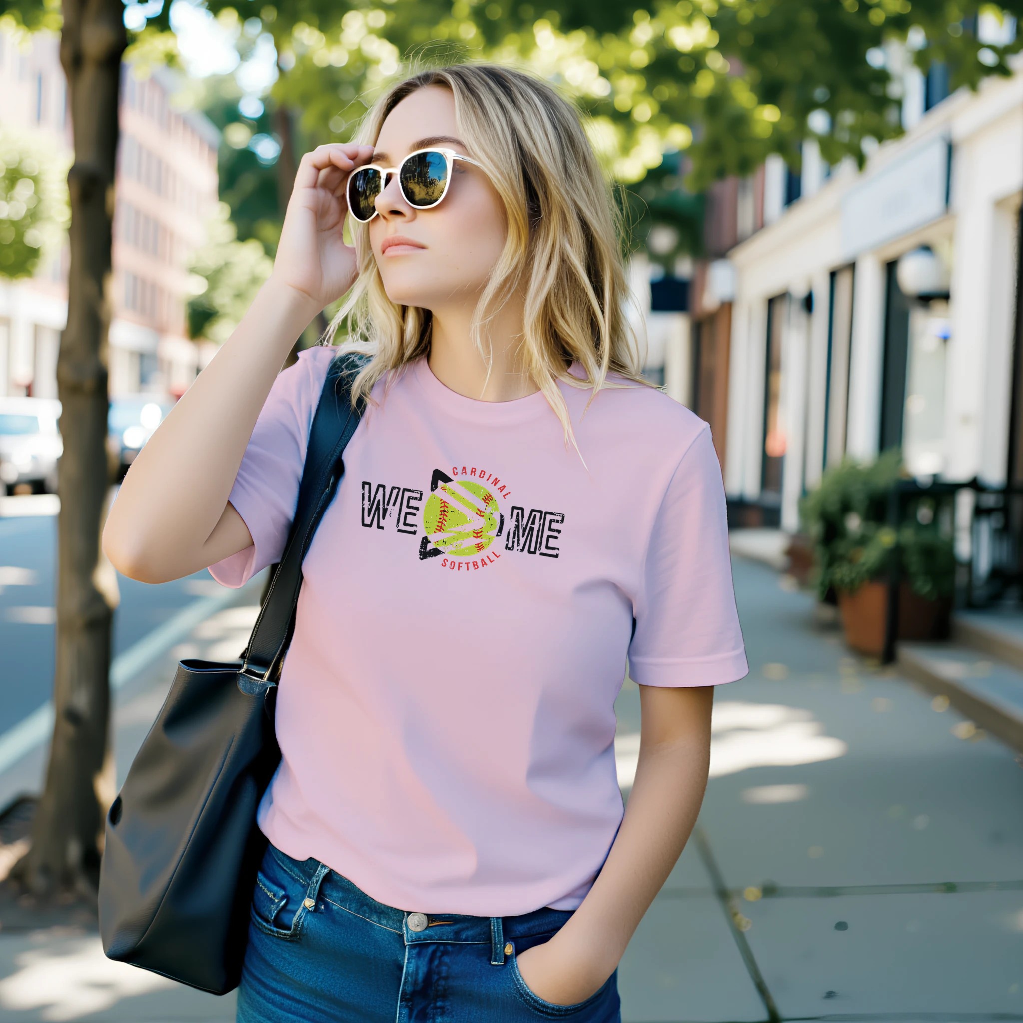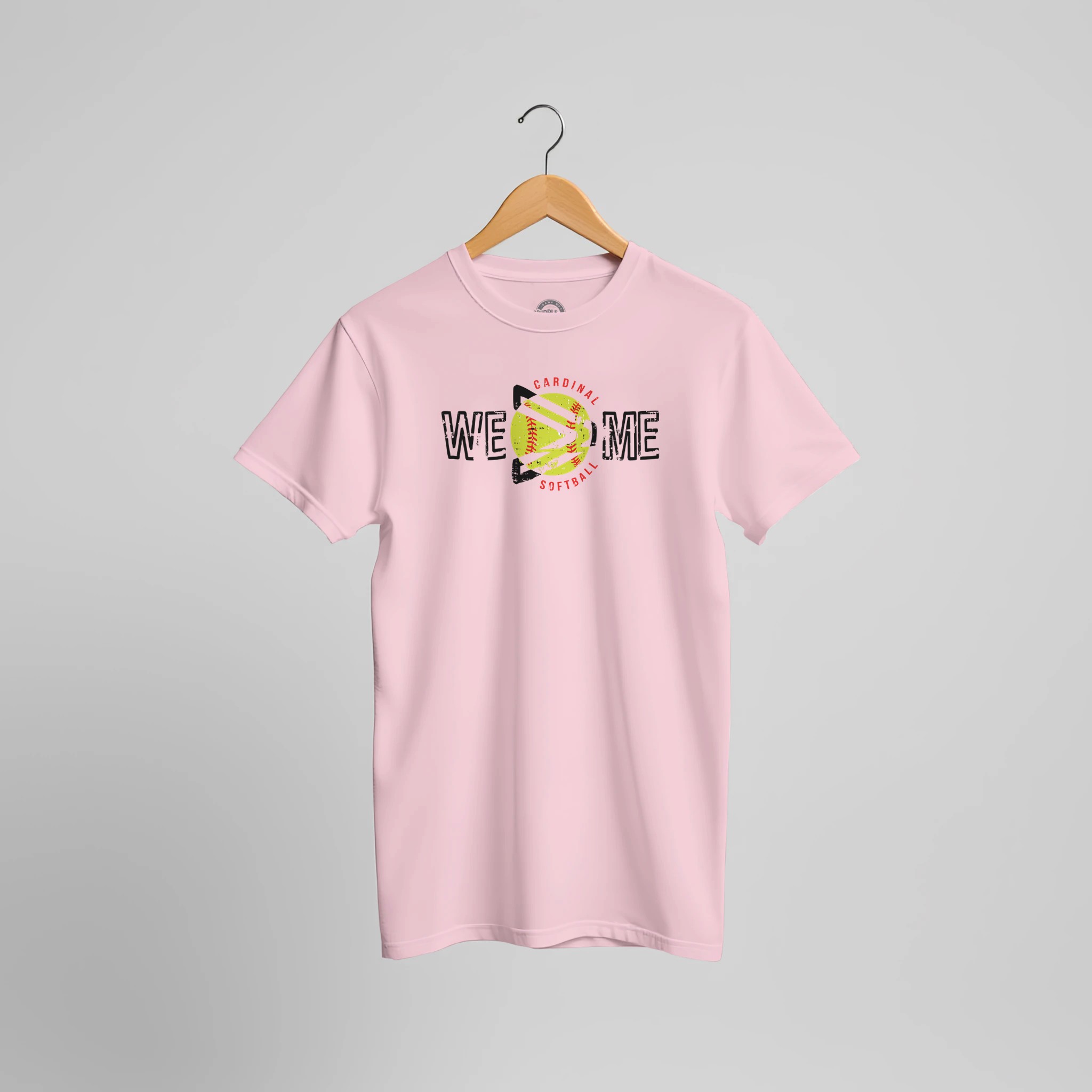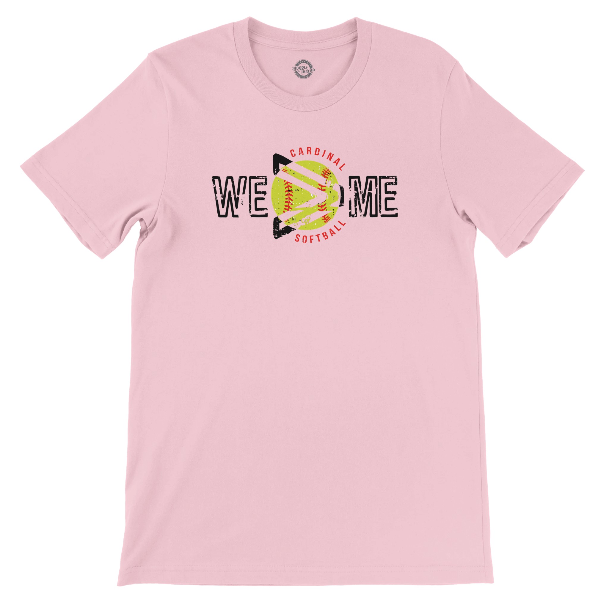 Lead with heart and play for the team! This WE > ME Cardinal Softball shirt features a unique circular design that places the “greater than” symbol right over a bright yellow softball. With its bold, distressed black lettering and “Cardinal Softball” arched in red, it is the perfect statement piece for players and coaches who know that victory is a collective effort.